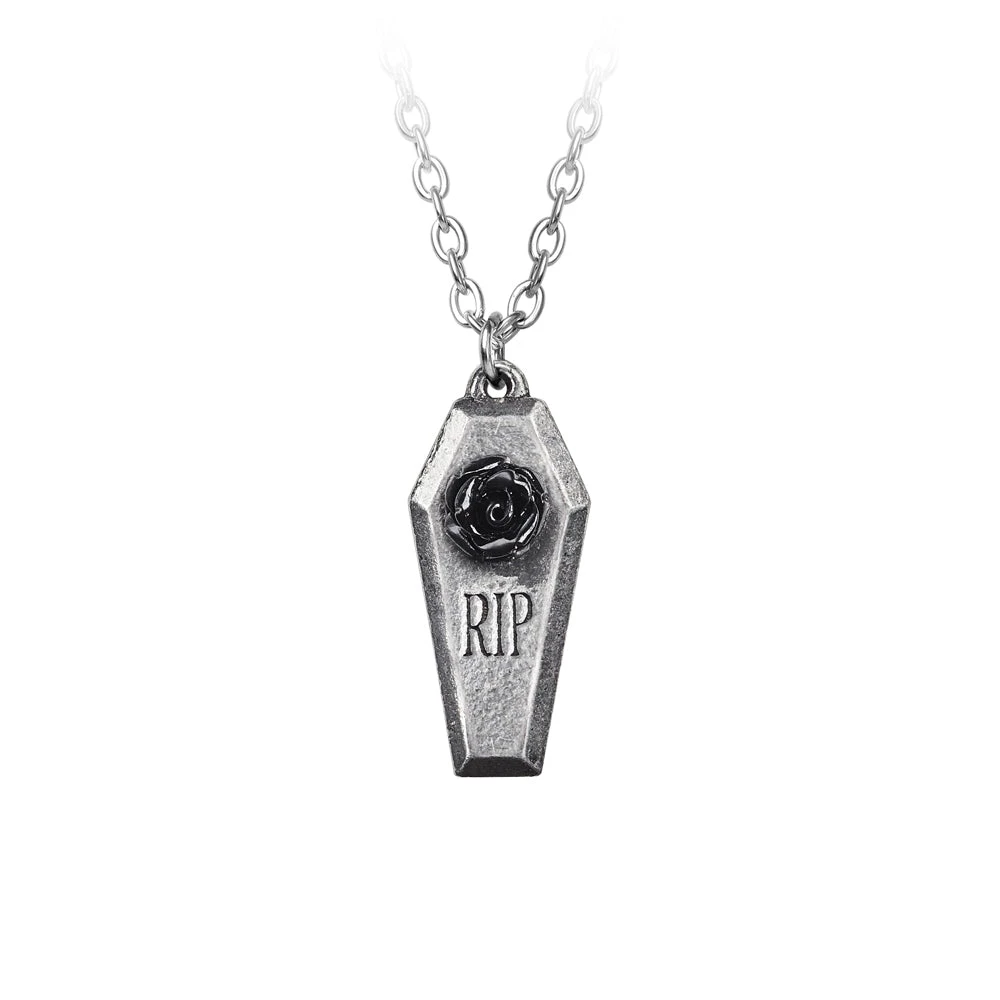 Coffin shaped pendant with R.I.P. engraved in the lid, decorated with a single, black, resin rose. Comes on an 18″ long fine chain.