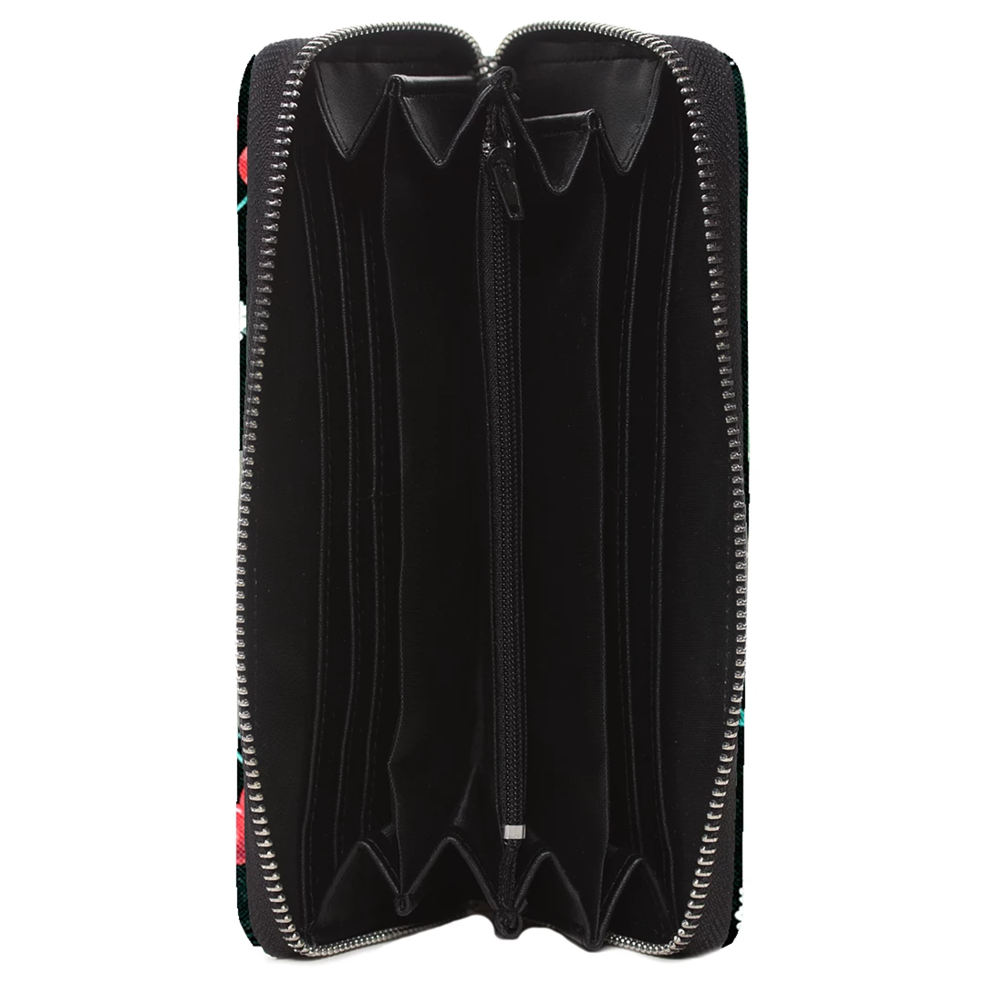 Delightful cherries and daisies dance on a background of black on this wallet from Liquorbrand! Made of a high quality faux leather, this zip-close wallet features their original graphics printed on both sides. Inside, there’s plenty of places to store your cash, cards, I.D., coins and more and the top zips closed to keep everything safe.