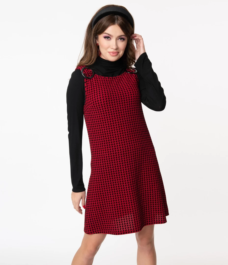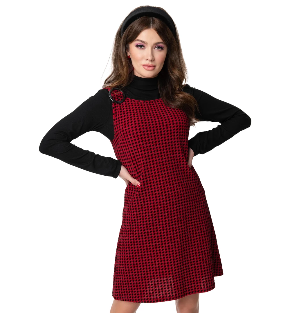 Serve some serious 1960’s mod looks in this Smak Parlour Art Department Shift Dress! This classic shift dress features a red and black houndstooth pattern throughout the sleeveless dress. The scoop neckline is framed by wide shoulder straps, faux buckle O rings while the casual silhouette drops to straight hemline high above the knees. This dress is perfect for layering or alone! The options are endless. Shown with the Bestsellers List Top in black, also available!
