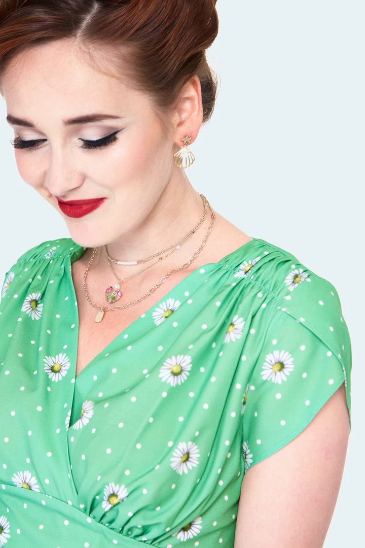 No matter if you’re headed for a parkside picnic or browsing your favorite antique shops, the Tabby Swing Dress from Voodoo Vixen is ready to take on the day! This 1940s inspired dress from Voodoo Vixen is made of a daisy and polka dot print on a pretty mint green background and features tulip cap sleeves, ruching at the shoulders, side pockets and a flattering v-neckline. Falling at the knee, this charming number fastens at the back with a concealed zipper.