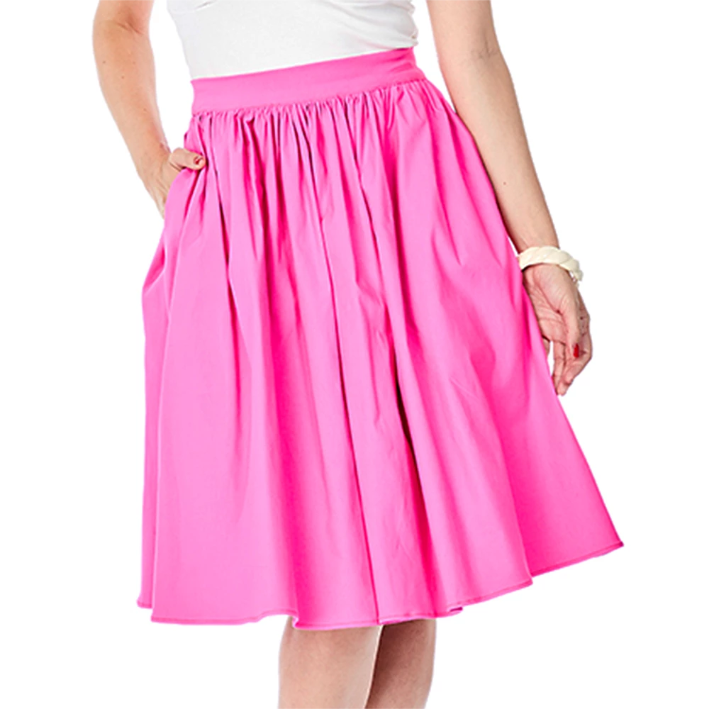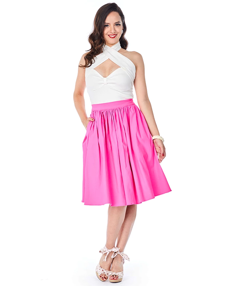 Add some retro flair to your outfit with the gorgeous Ellie Gathered Skirt from Bettie Page Clothing! Crafted from a nice weight material in hot pink (seriously bright!), this gathered full skirt has a wide waistband and generous side pockets. Zips up back to fasten.