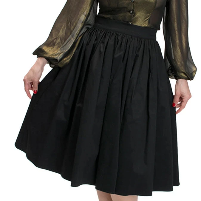 Add some retro flair to your outfit with the gorgeous Ellie Gathered Skirt from Bettie Page Clothing! Crafted from a nice weight material in classic black, this gathered full skirt has a wide waistband and generous side pockets. Zips up back to fasten. Dress up with a nice top or keep it casual with a graphic tee!