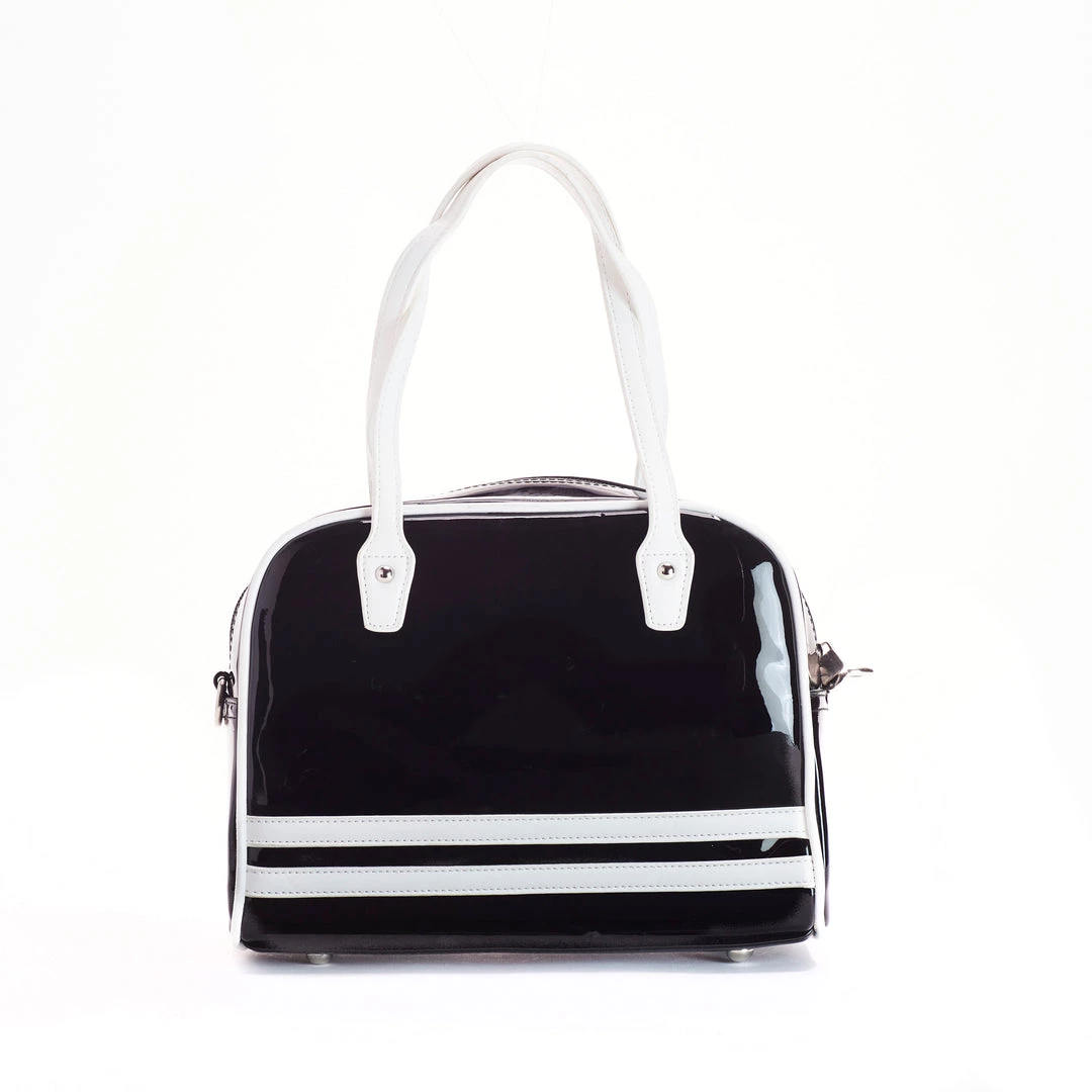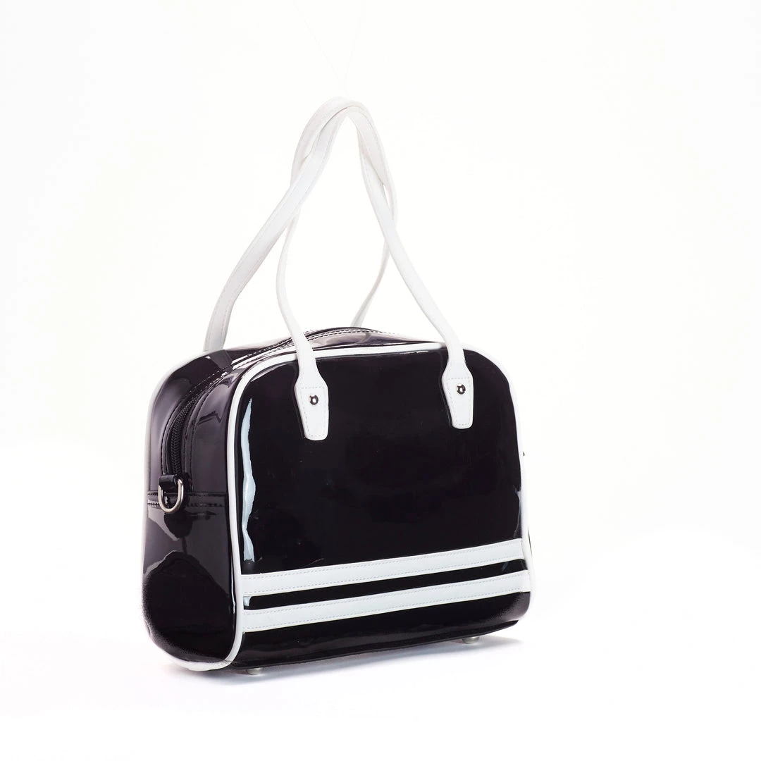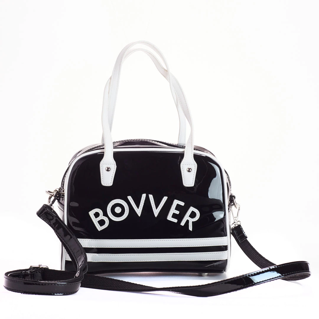 The black and white Bovver gig bag has a classic 2 tone vibe. Made of shiny high quality vinyl and trimmed in white applique lettering and handles. Each bag includes a detachable cross body strap. The inside is fully lined with a houndstooth fabric and features zip and slip pockets