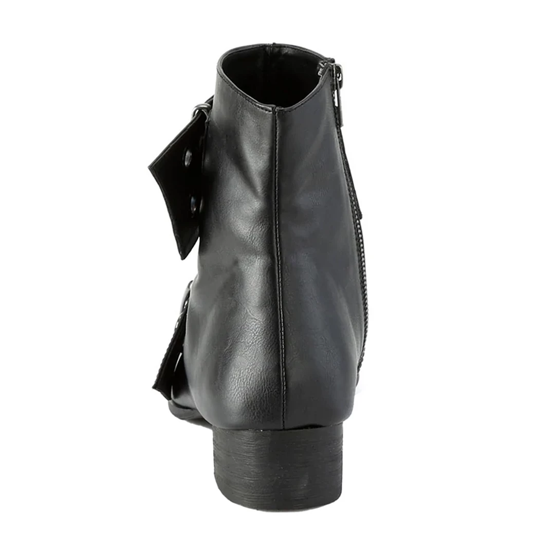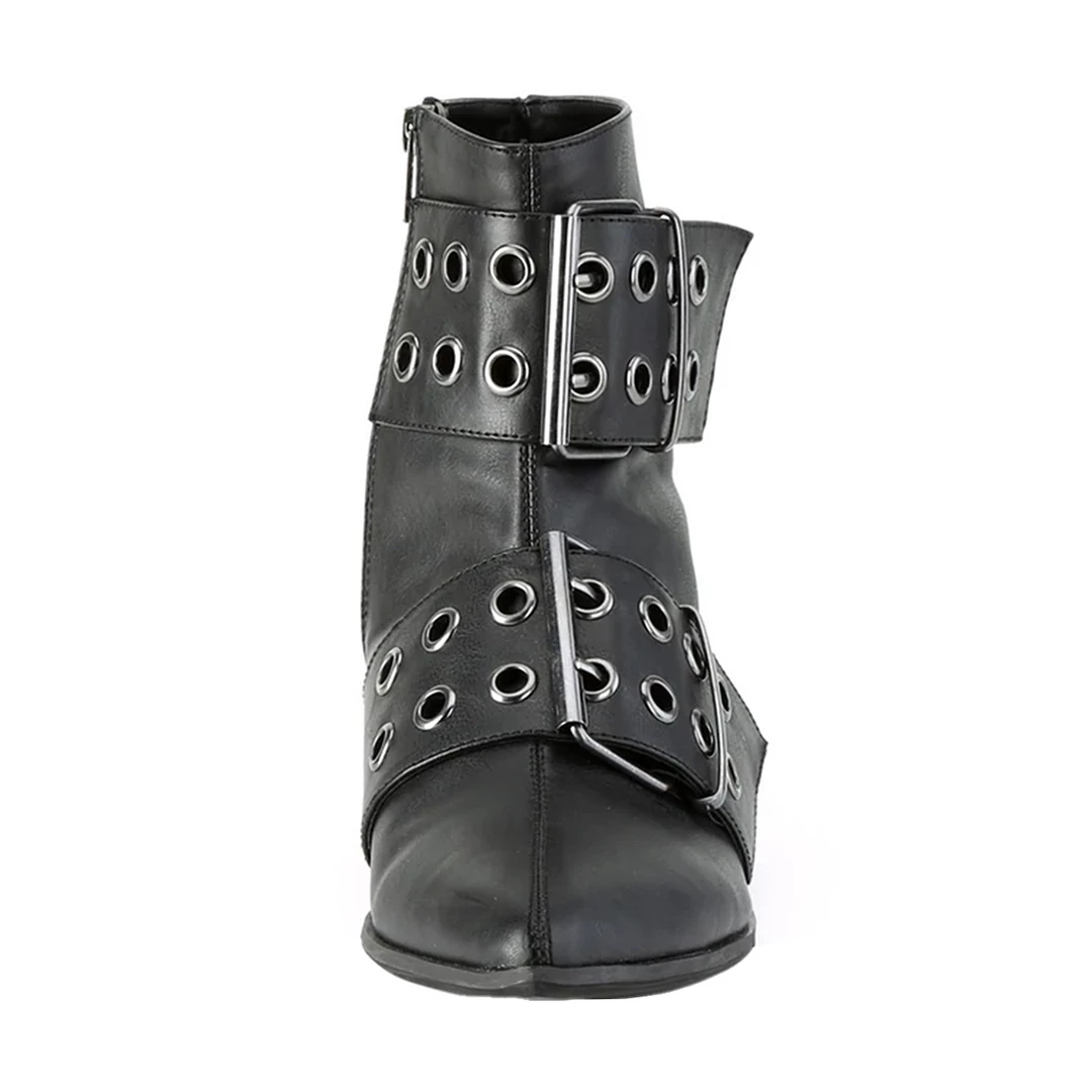 Buckle up and go in these amazing boots from Demonia! A classic winklepicker shape, these Big Buckle Boots feature a pointed toe and a 1.5″ block heel. The two large double grommet buckle straps cross over the front for a bold style, while the inside zip closure keeps them easy to take on and off. Made of a high quality vegan leather.