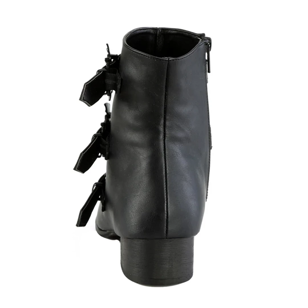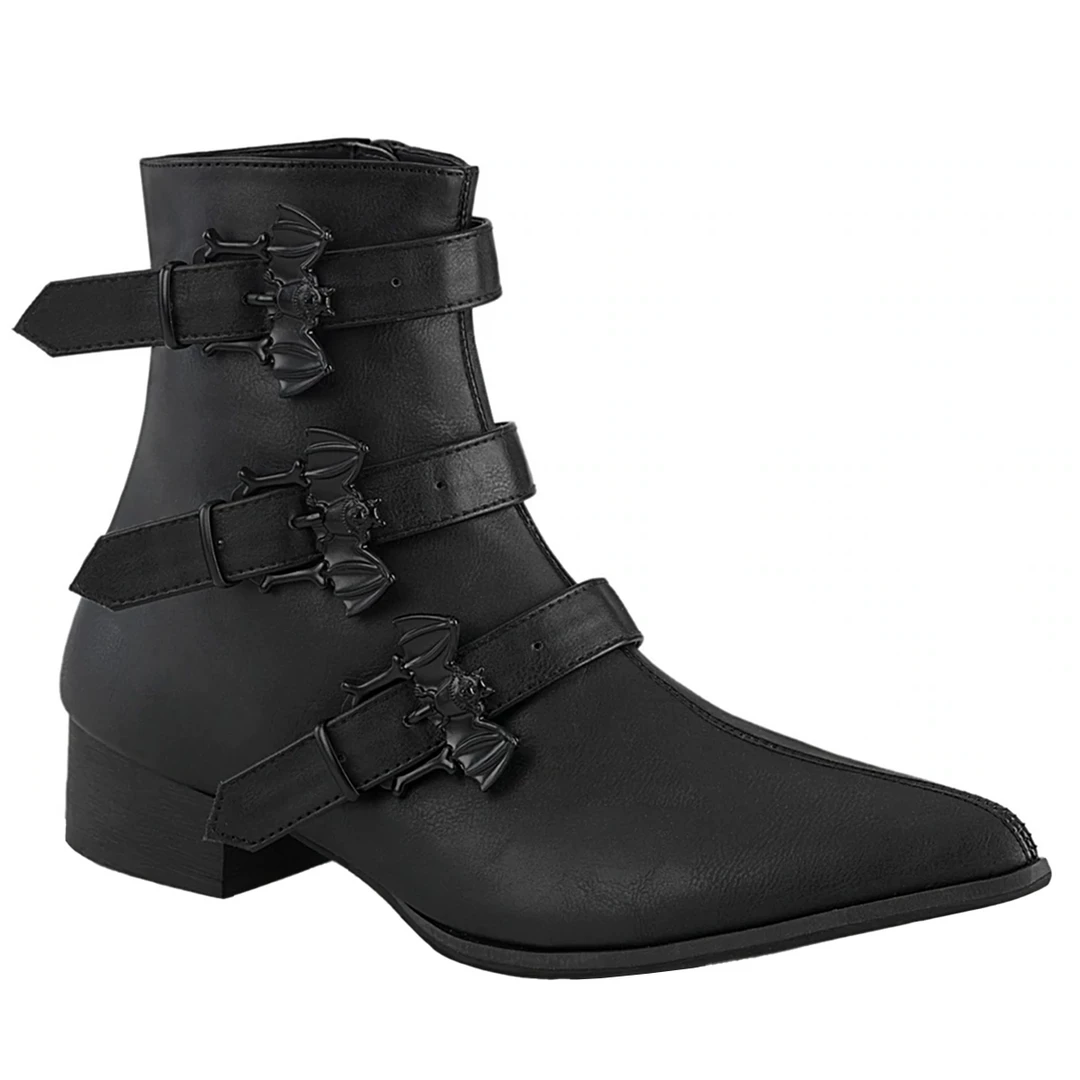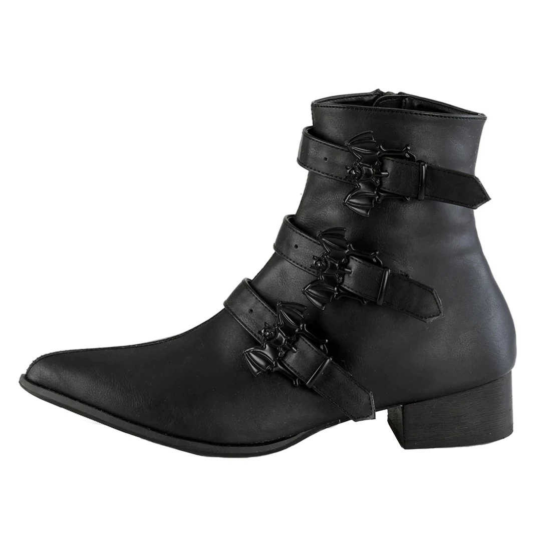 And out come the bats! From cemetery to crypt, these Warlock Bat Buckle Ankle Boots from Demonia are what spooky dreams are made of. Made of high quality vegan leather, these winklepicker style boots feature a pointed toe and triple straps complete with detailed bat shaped buckles. The inside zip closure makes them easy to take on and off.
