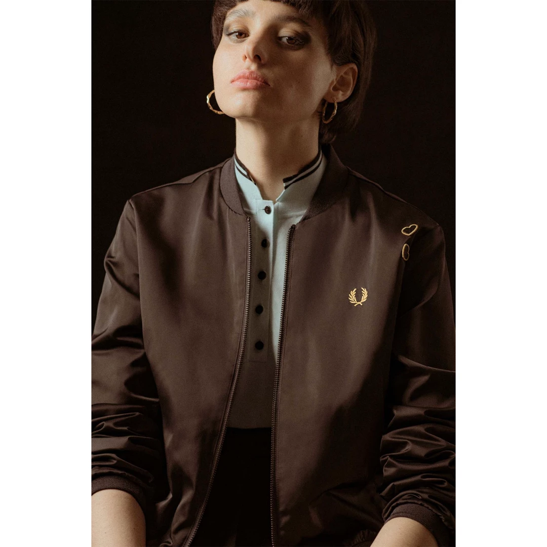 Whether she was at home on the streets of Camden, performing her music on world stages, or styling herself for photoshoots, Amy was synonymous with the Laurel Wreath. Channelling her love of classic Americana, Fred Perry’s Satin Bomber Jacket is a silhouette that recalls the girl groups of the ‘50s and ‘60s which Amy drew constant inspiration from. Key detailing includes a satin sheen, front-button opening and two signature love hearts in gold above the Laurel Wreath, a reference to Amy’s distinctive tattoos. **Listed in US Sizing! Please see size chart**