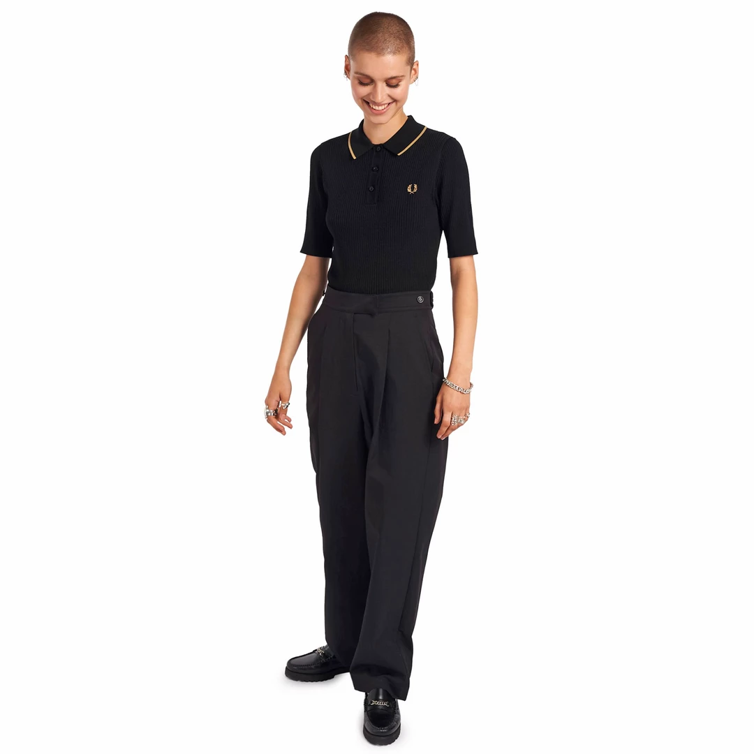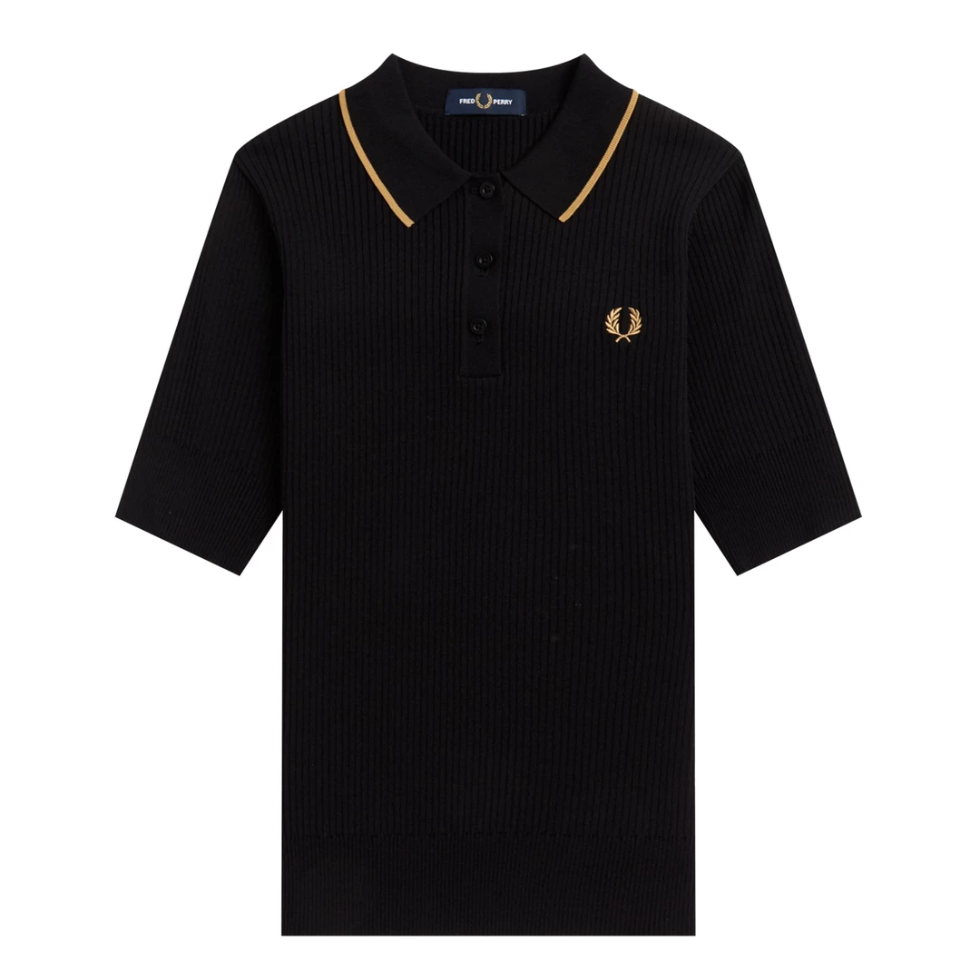 Taking obvious style cues from the original Fred Perry Shirt, the Ribbed Knitted Shirt is a luxe take on their signature design. Constructed with collar edge tipping in contrast gold alongside their signature Laurel Wreath embroidery on the left chest, with a ribbed hem and cuff, this black shirt is a classic option for any outfit. **Listed in US Sizing!