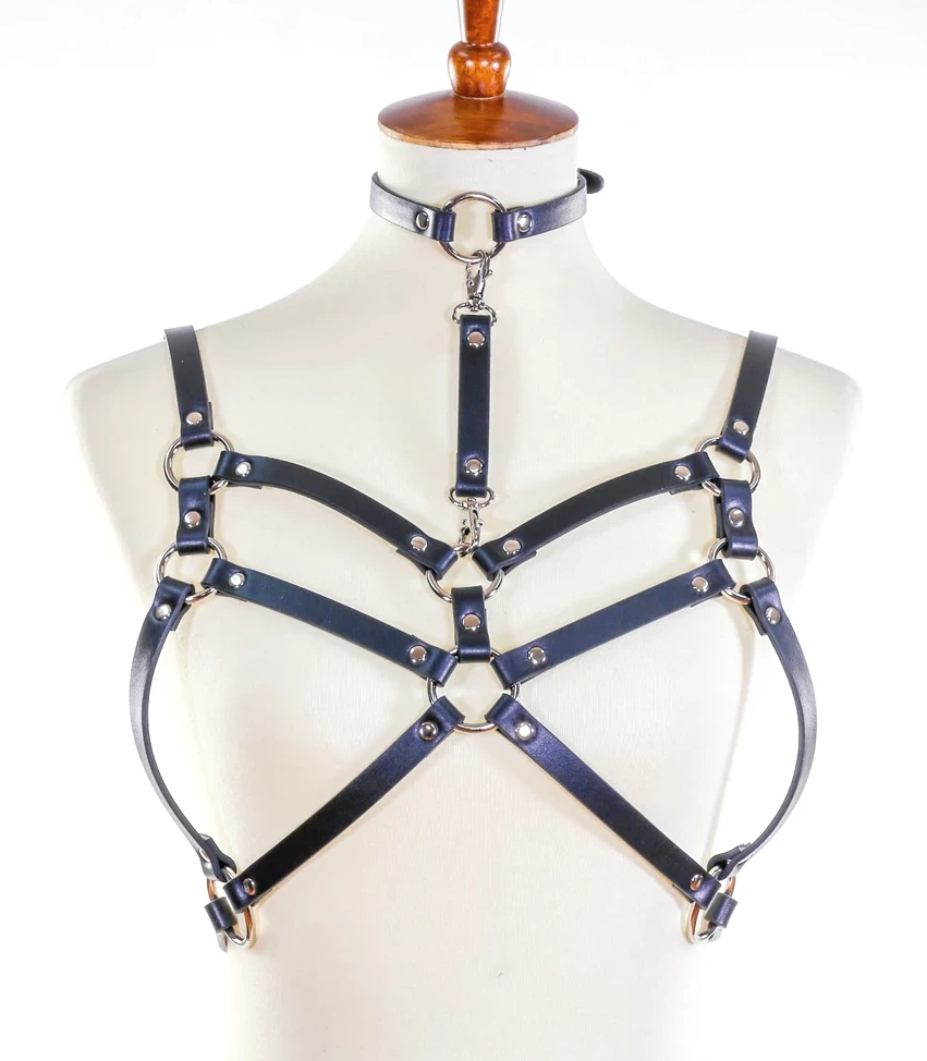 This double strap bra style harness has an attached choker joined by toggle clip hooks. Fastens in the back with buckles and is adjustable. Genuine leather with silver hardware, it’s very high quality and would look great layered over a little black dress!