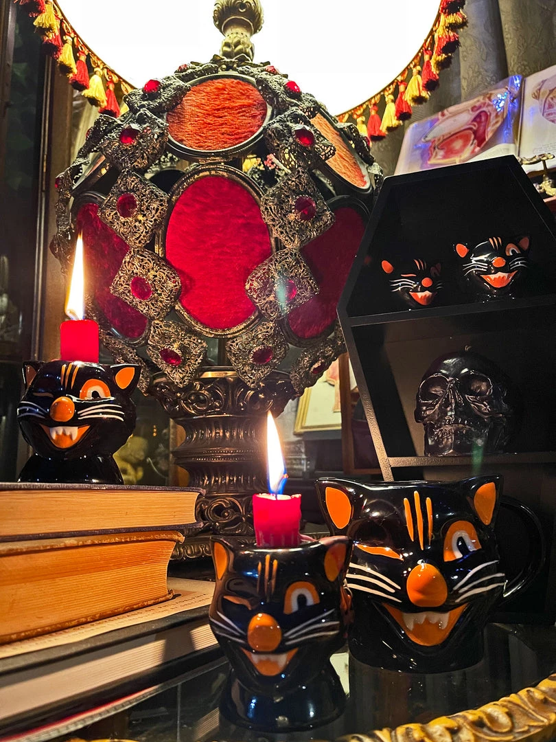 We’ve taken our favorite vintage Halloween familiar and turned him into all new candle holders! Create some black cat magic anywhere in your home with our charming Black Cat Candle Holders. Made of ceramic, you will get a set of two – each can hold a standard taper candle.