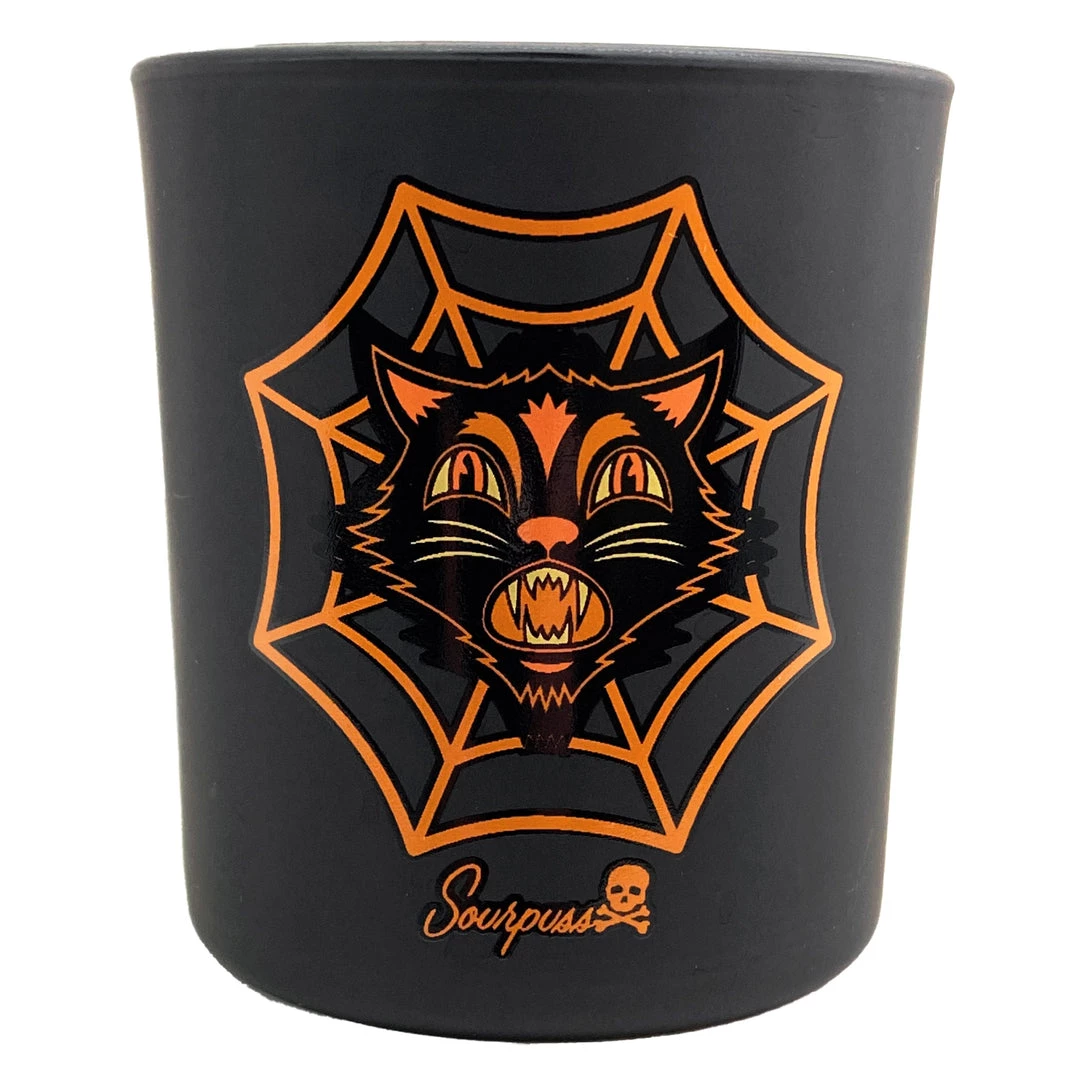 Introducing our new vegan soy candles. We teamed up a luxury candle company and created this black glass candle with black soy wax and black wick. Our Classic Halloween cat artwork looks pretty cool. We think you’ll love the scent, we mixed Patchouli, vanilla and musk. Comes in a Sourpuss gift box.