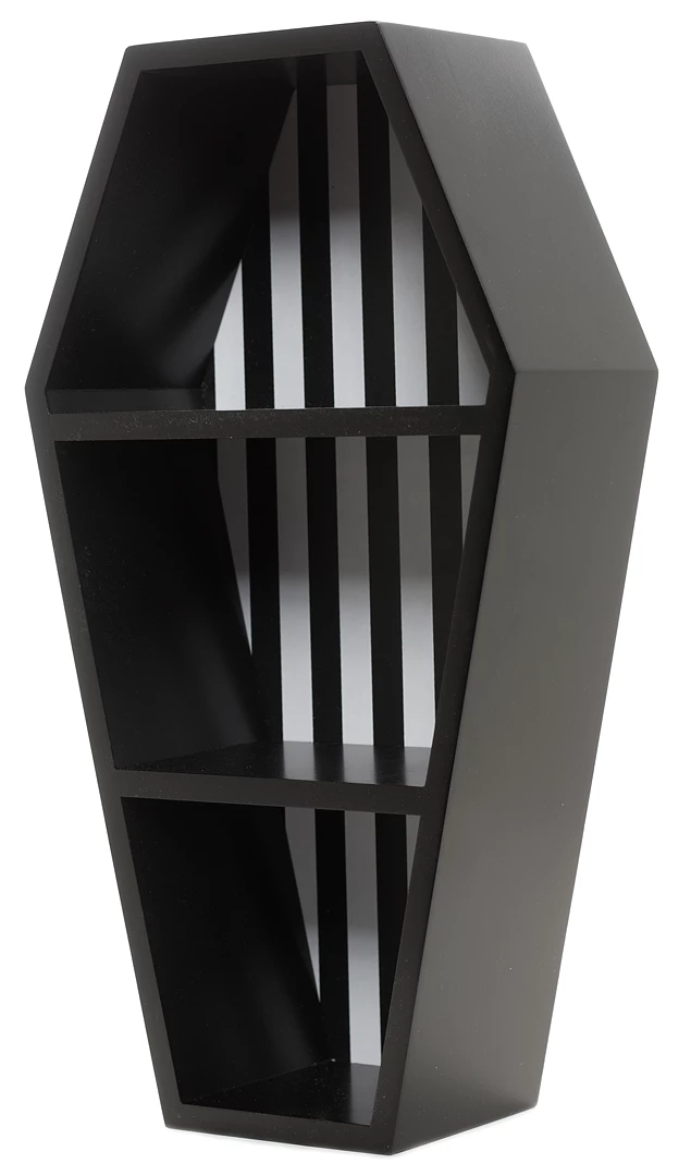 We’ve taken our popular coffin shelf and given it a stripey makeover! Our Striped Coffin Shelf is perfect for showcasing your most prized possessions. Thanks to the black and white striped backing, you can now better showcase darker objects and all your favorite tchotchkes – maybe some Beetlejuice or Tim Burton inspired pieces?! This shelf is ready to hang thanks to the sawtooth hanger attached to the back, or just place on a flat surface where you need some an extra display area!