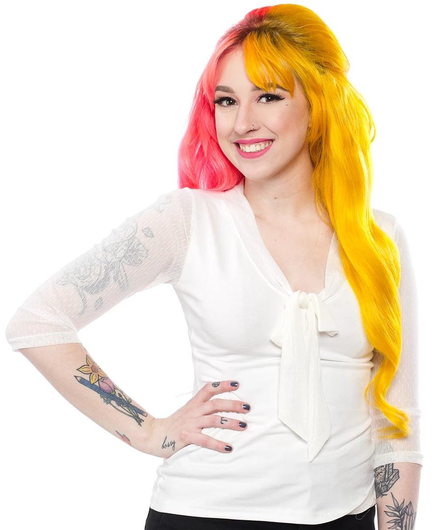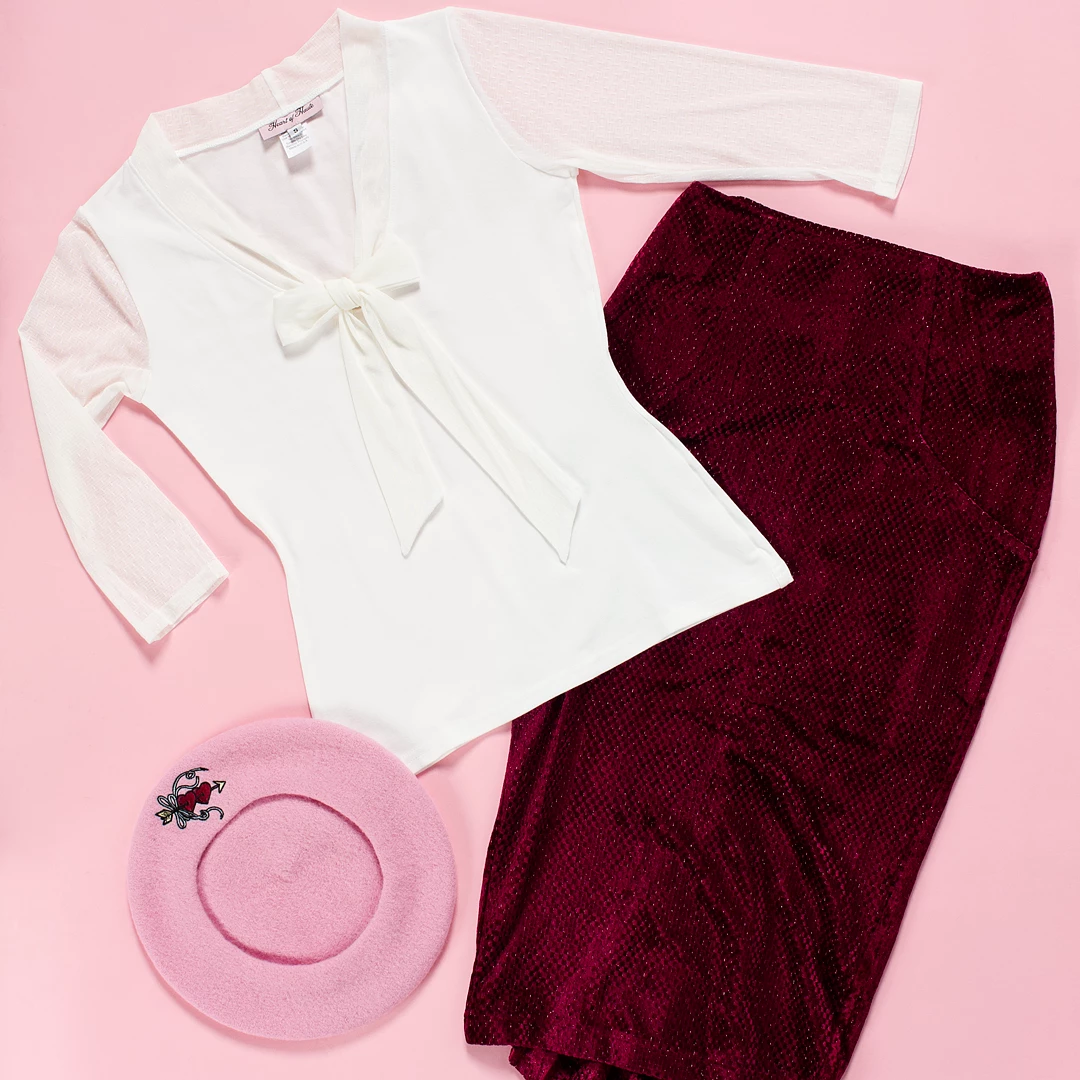 The Inspire Top from Heart of Haute is your go-to top to look dressed up while still being comfy. This high quality knit jersey top in ivory features a tie front collar and 3/4 length sleeves, which both have a polka dot lace detail.