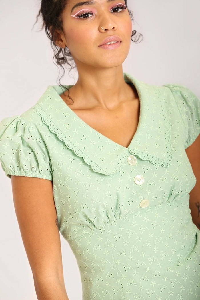 Make your style minty fresh in this darling dress from Hell Bunny! The Celia Mini Dress is crafted from a pretty Broderie Anglaise embroidered fabric in mint green. An A-line mini dress shape, this 1960s-inspired number features a V neckline with lace trim collar, short puff sleeves with elasticated cuffs and decorative pearl effect buttons down centre front of bust. Zips up center back.