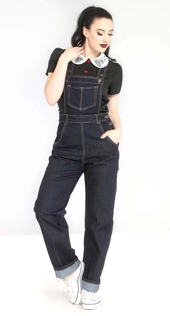 The amazing Elly May overalls from Hell Bunny are classic long wide-legged dungarees in a comfortable stretch fabric – you’ll want to do everything in these babies! With a classic 1940s/50s style, they also have adjustable buckle straps that cross-over in the back, functional pockets, and even belt loops. They fasten at the side with embossed buttons. Pair with short sleeved shirts in warmer months, and sweaters when it’s cooler!