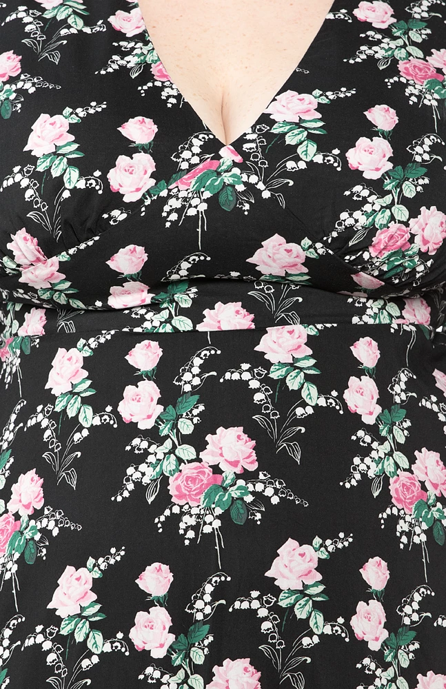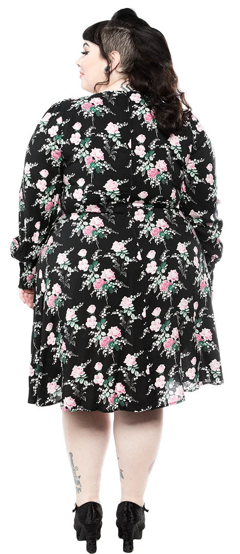 The Felicia Dress from Hell Bunny is a fabulous cooler weather dress option! Featuring a pretty print of roses and lilies of the valley in white and pink on a black background, this retro inspired dress has long sleeves, a flattering v-neckline and shearing detail at the cuff. Dress fastens at back with a center zip.