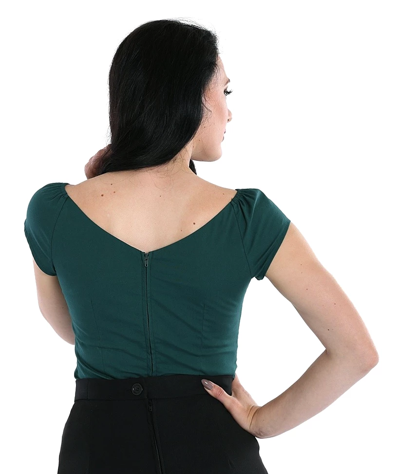 Feel just like a sultry siren of Old Hollywood when you slip into the Petunia Top from Hell Bunny! Made of the most gorgeous and rich hue of forest green, this plain stretch cotton top is flattering from shoulder to hem. The wide v neckline frames your face beautifully while the cap sleeves with elasticated shoulder allows this to be worn slightly off shoulder. Fitted to body, length hits right at the hips. Zip fastening down the back.