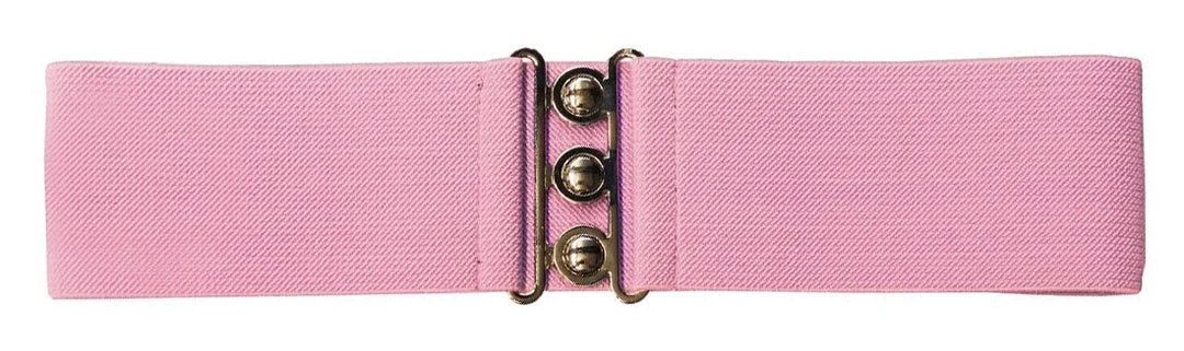 Create instant curves with this retro belt in pink from Hell Bunny! This wide elastic belt fastens closed in the front with a silver colored clasp.