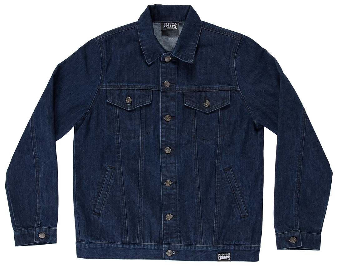 Our popular Kustom Kreeps Jacket now comes in blue denim. It has a slim fit, customized Kustom Kreeps buttons, and is the perfect background for all of your patches and pins.