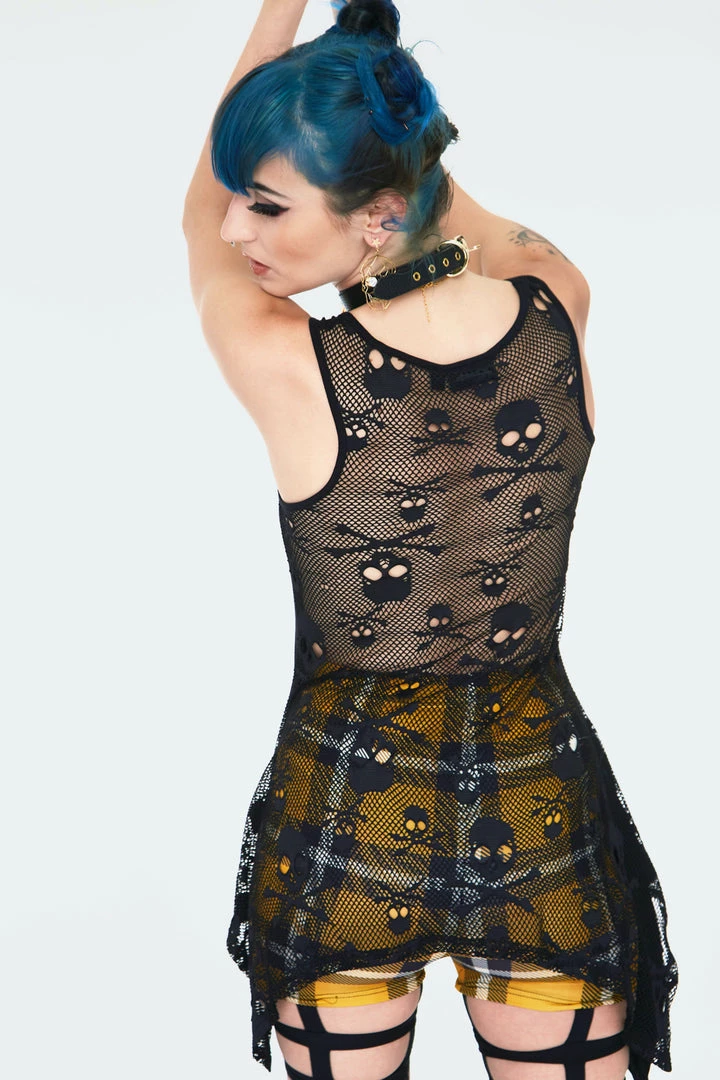 Get lost in the graveyard in this mesh-back tank top from Jawbreaker. With a sheer skull patterned mesh back and handkerchief hem, this unique top looks great with leggings for an easy outfit option!