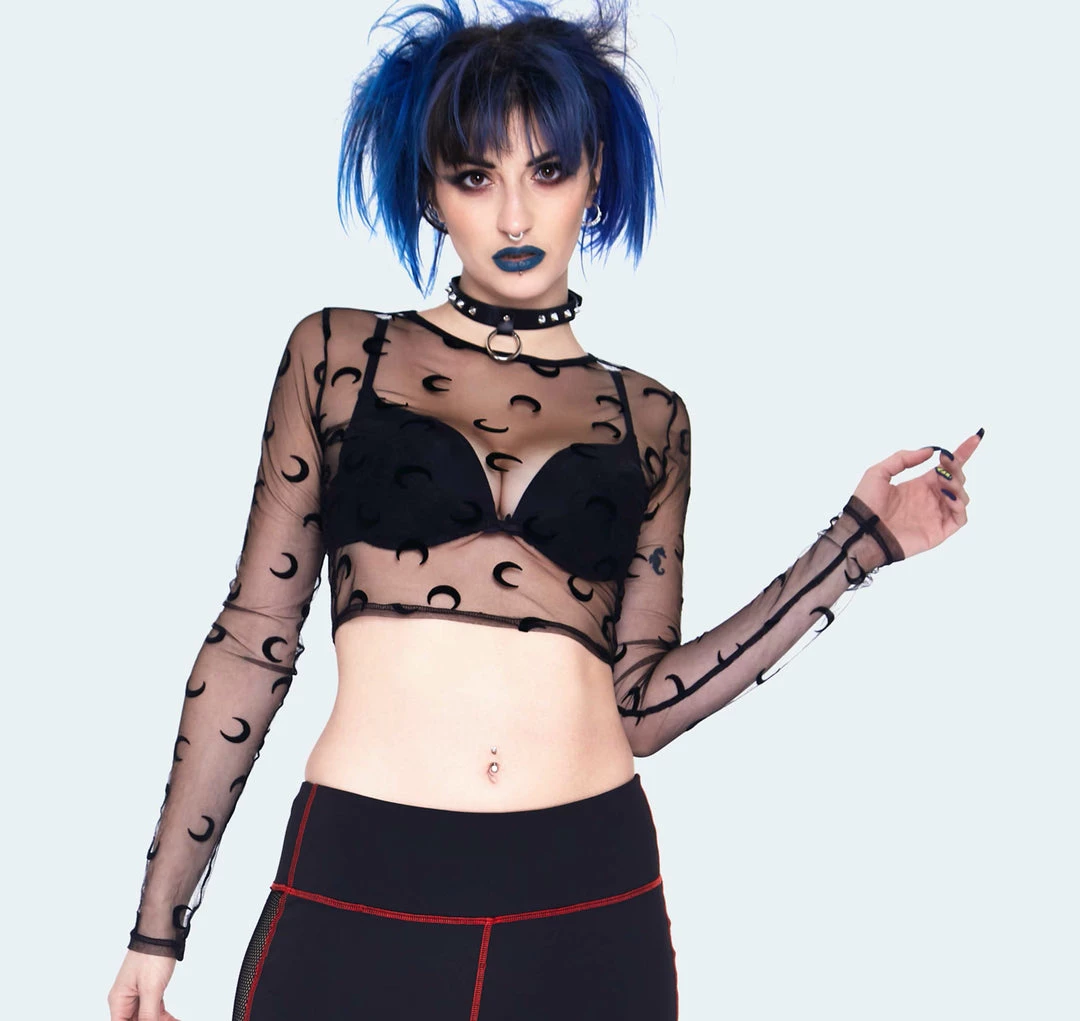 Howl at the moon in this mesh crop top from Jawbreaker. Made of a sheer black material with crescent moons all over, it features a shorter cropped length and long sleeves. A perfect layering piece, we love this under a pinafore, dress, or overalls!