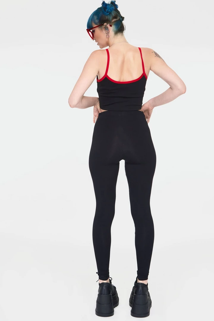 Show off your dangerous side with the Thorns & Roses Leggings from Jawbreaker. These black leggings feature graphics of white roses and thorns design down each leg.