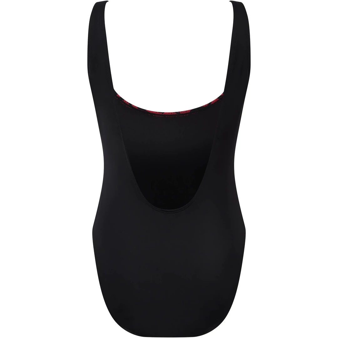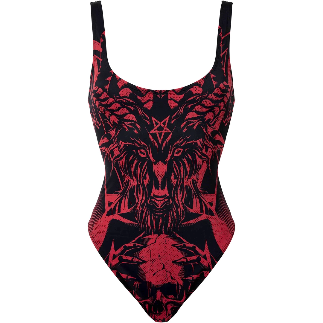 Be the baddest babe at the beach in this one piece swimsuit from Killstar! The Beach Beast Swimsuit in made of a soft touch, stretch nylon blend with a statement Baphomet print in red on the front. The back is a deep scoop back style. Please note – this swimsuit runs large. Please size down for the best fit.