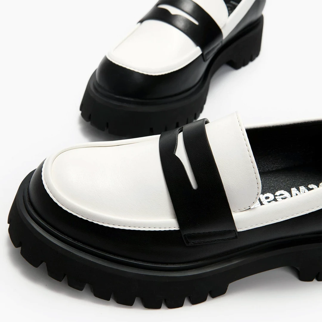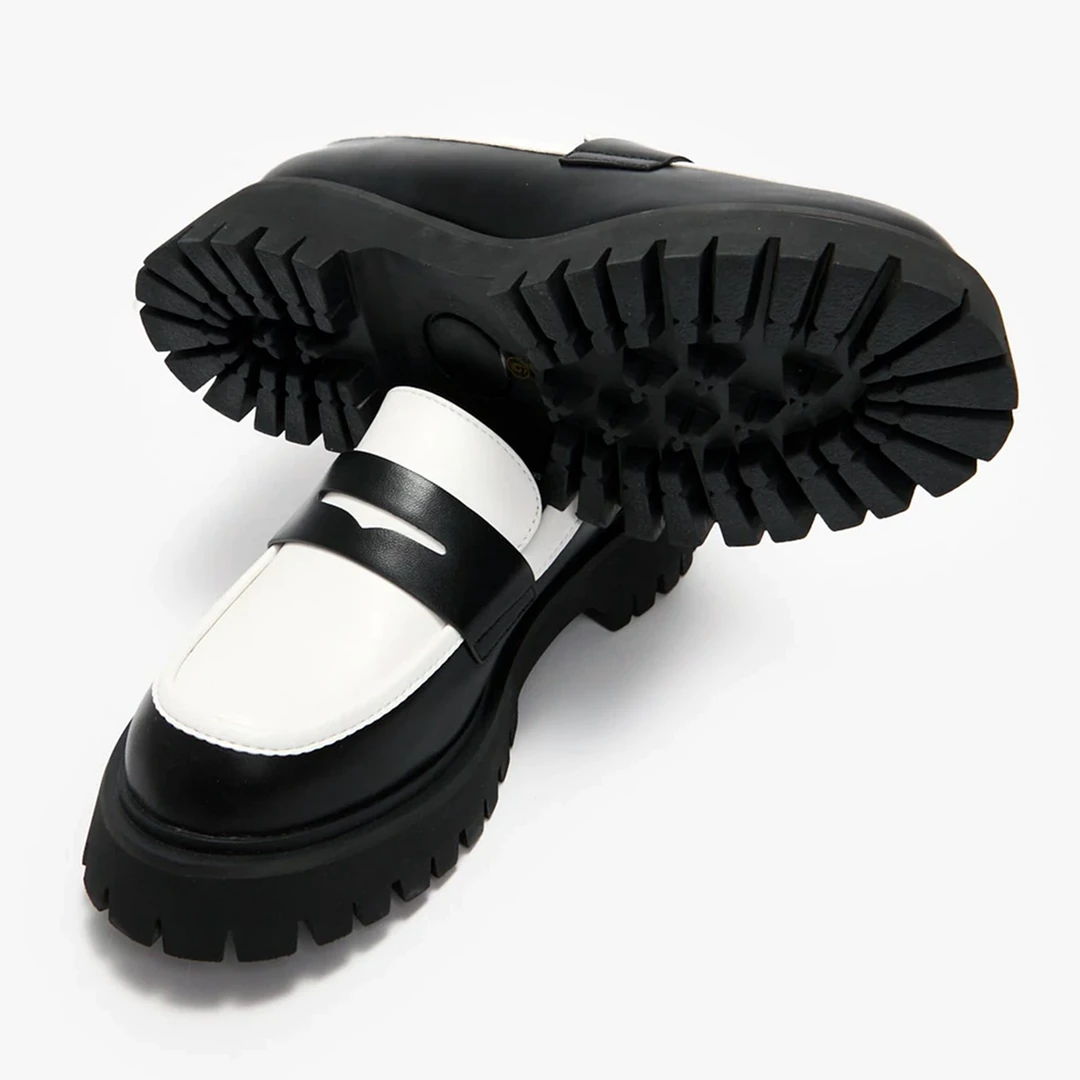 Birch Monochrome Loafers with a twist, slide them on and you are ready to go! These black loafers feature white detailing on the top, top stitching, penny loafer design, cushioned insole and chunky sole. All shoes are made from water based PU, manufactured using regenerated water – animal free, of course!