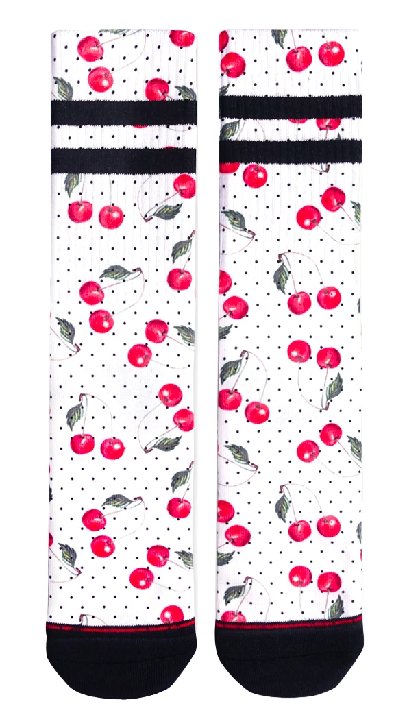 Slice of cherry pie, comin’ right up! Made of a soft quick dry material, these crew socks have an all over print of sweet cherries and polka dots and classic gym sock stripe styling.