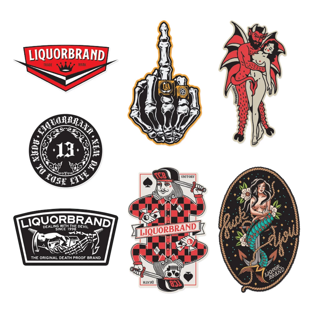 Stick ’em up with this pack of vinyl kiss-cut stickers from Liquorbrand! You’ll get a variety of stickers, 7 different designs in total including the popular devil/lady, fuck you mermaid, middle finger, and more. Each pack includes 21 stickers – 3 of each design – so you can stick ’em anywhere and everywhere!
