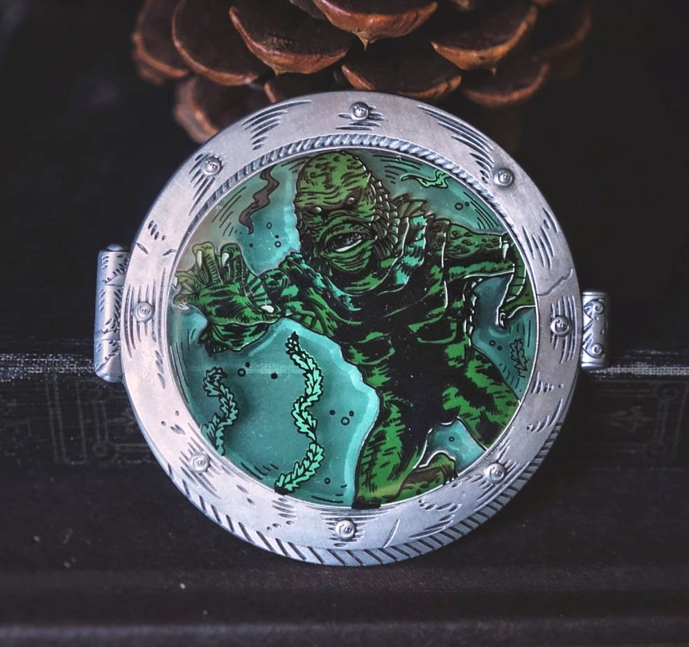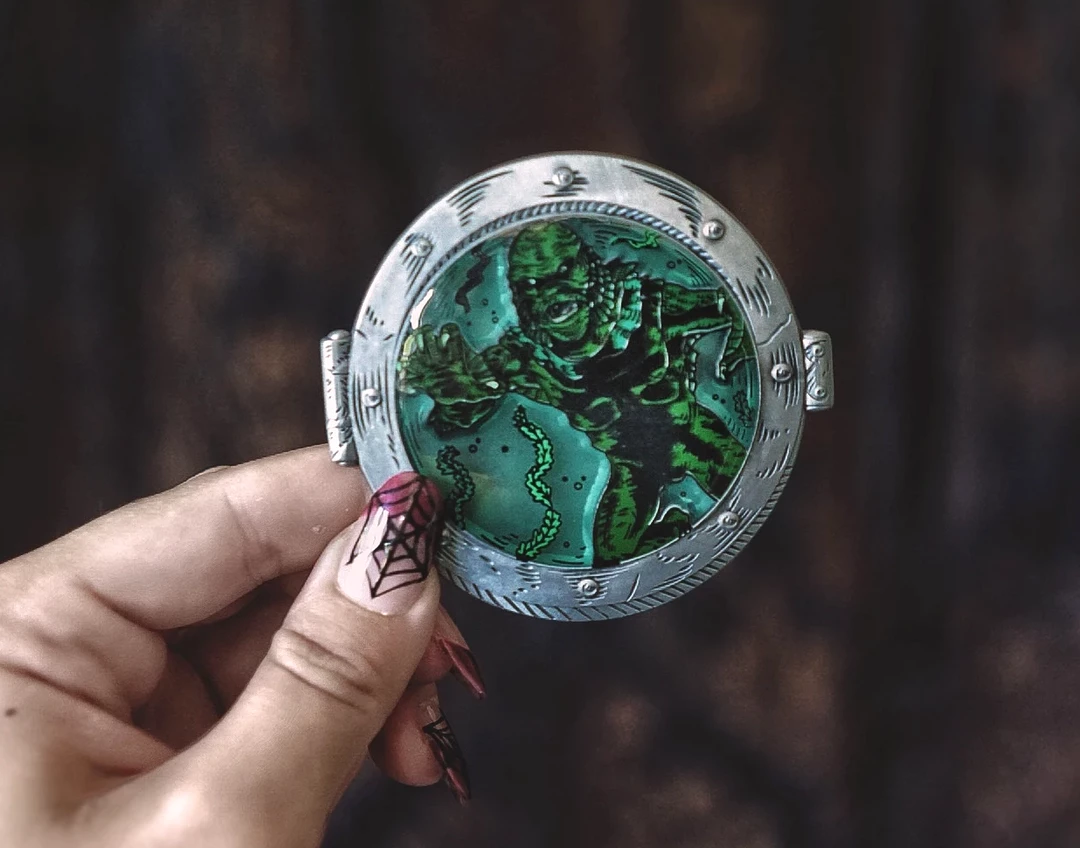 Black lagoons are cooler than regular lagoons. This amazing enamel pin from Lively Ghosts features our favorite lagoon dweller, crafted from hard & transparent enamel in a stamped metal porthole frame. It would look so good on a coat!
