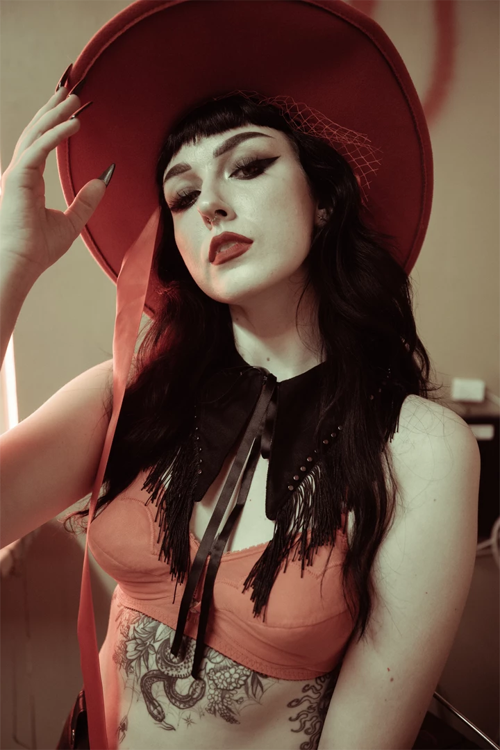 This detachable “With the Band” Fringe Collar from Lively Ghosts is an accessory to accompany all vintage inspired looks! This is the Black Sabbath version, crafted from black vegan suede & complete with silver studded edges and black fringe. Adjustable, it can be be tied to fit you best with the satin ribbon front closure.