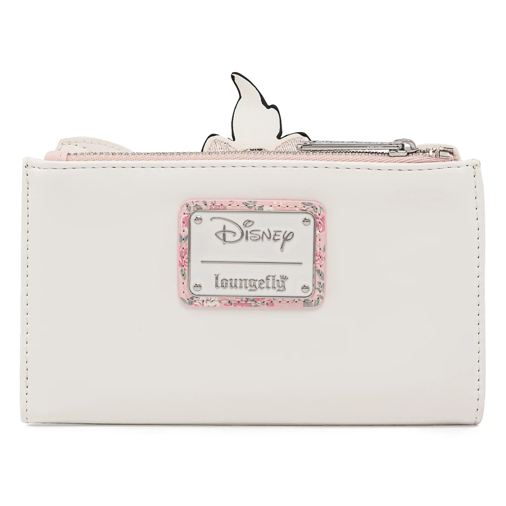 Marie is as cute as can be! Bring some cuteness into your life with this Disney Aristocats Marie Floral Flap Wallet from Loungefly. Marie’s big blue eyes make a beautiful contrast to the pink and white color scheme. This wallet is made of a high quality vegan leather with applique, embroidered, and printed details. Wallet snaps closed, has a zipper pocket and sturdy metal hardware. The interior has cute matching lining, a zip coin pocket and plenty of slots for all your cards.