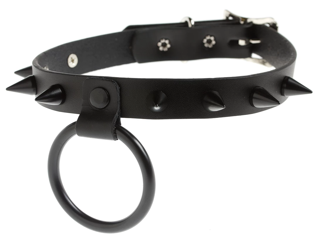 Be in your element with this statement bondage choker! This leather choker features 3/4″ matte black cone spikes and a large statement O-ring in matching black matte at the center. Buckle hardware is silver.