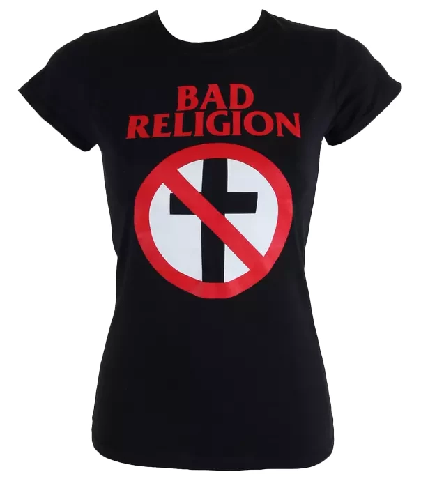 Classic Bad Religion crossbuster logo on a fitted, black, 100% cotton ladies tee. Officially licensed.