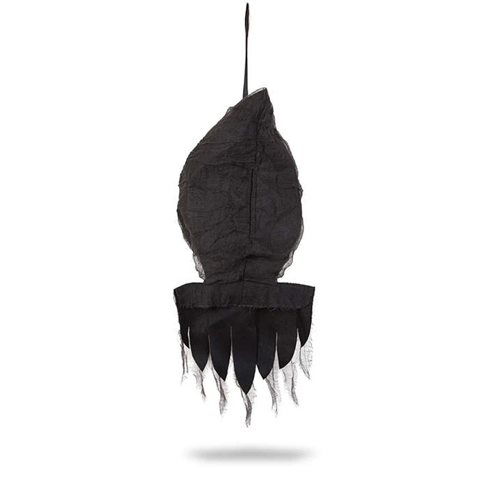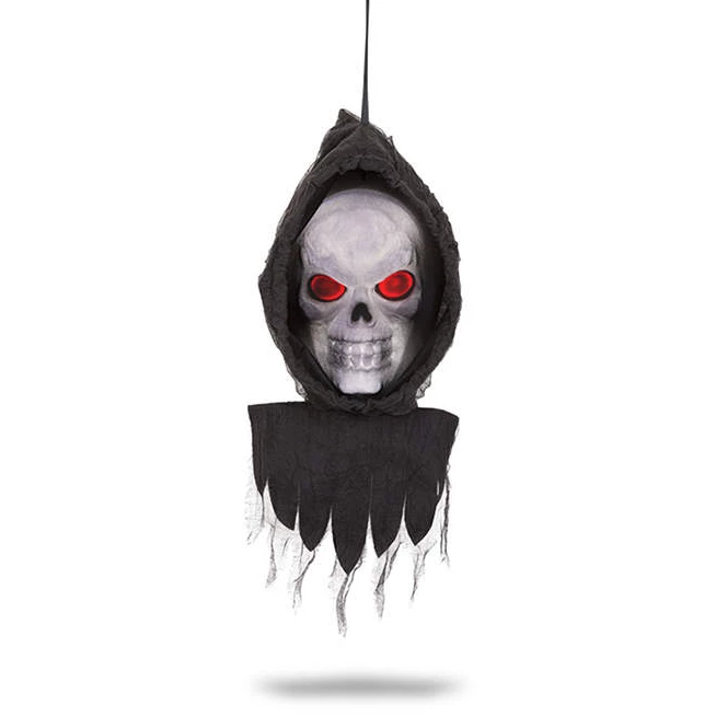 Let this creepy reaper strike fear into your guests during Halloween! He hangs from his tattered cloak and hood by a loop as his face illuminates in flickering delight. Face appears in shadow until motion activated to make the eyes flicker red and strobe effect with face. Also emits a variety of spooky sayings. Battery operated for easy placement, this bone-rattling figure is a great addition to a haunted indoor or outdoor display.