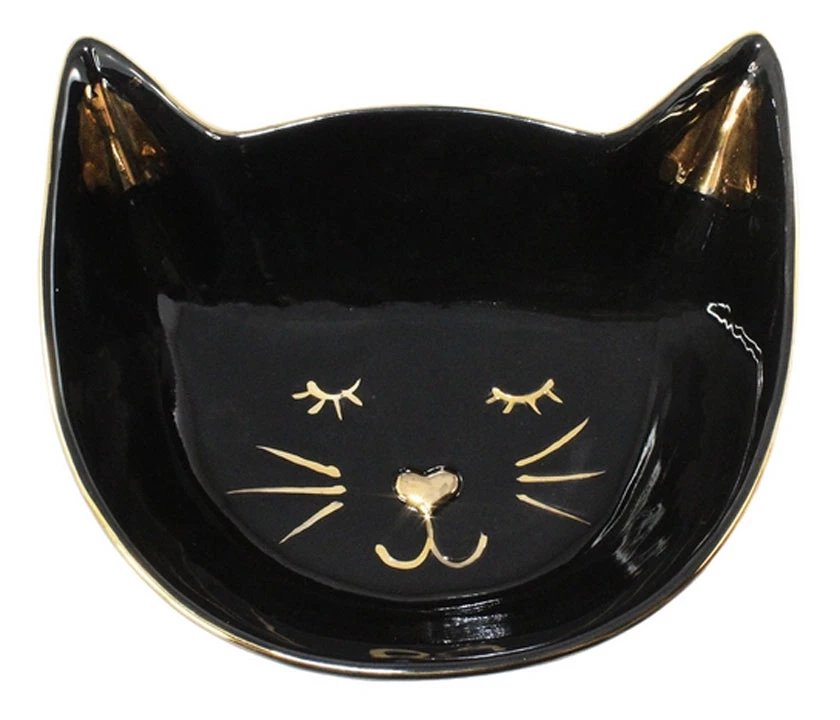 Black ceramic bowl of a cat face outlined in metallic gold. Great container to store your keys, coins or jewelry.