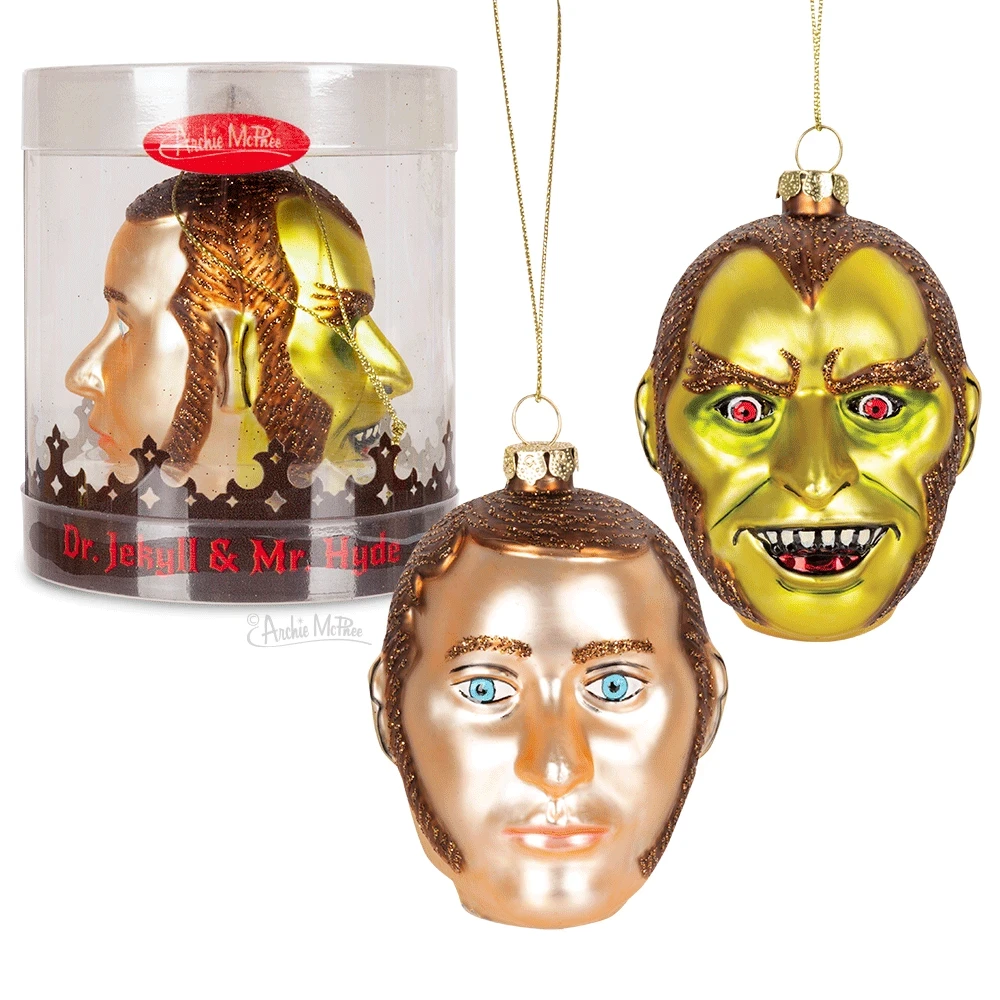 Everyone knows the story of Robert Louis Stevenson’s Dr. Jekyll and Mr. Hyde, but for some reason, people don’t associate it with Christmas. We think this two-sided hand-blown glass ornament is the perfect expression of naughty and nice. Turn the ornament one way, and you get the good Dr. Jekyll, flip it around, and you have the naughty Mr. Hyde. Includes string for hanging.