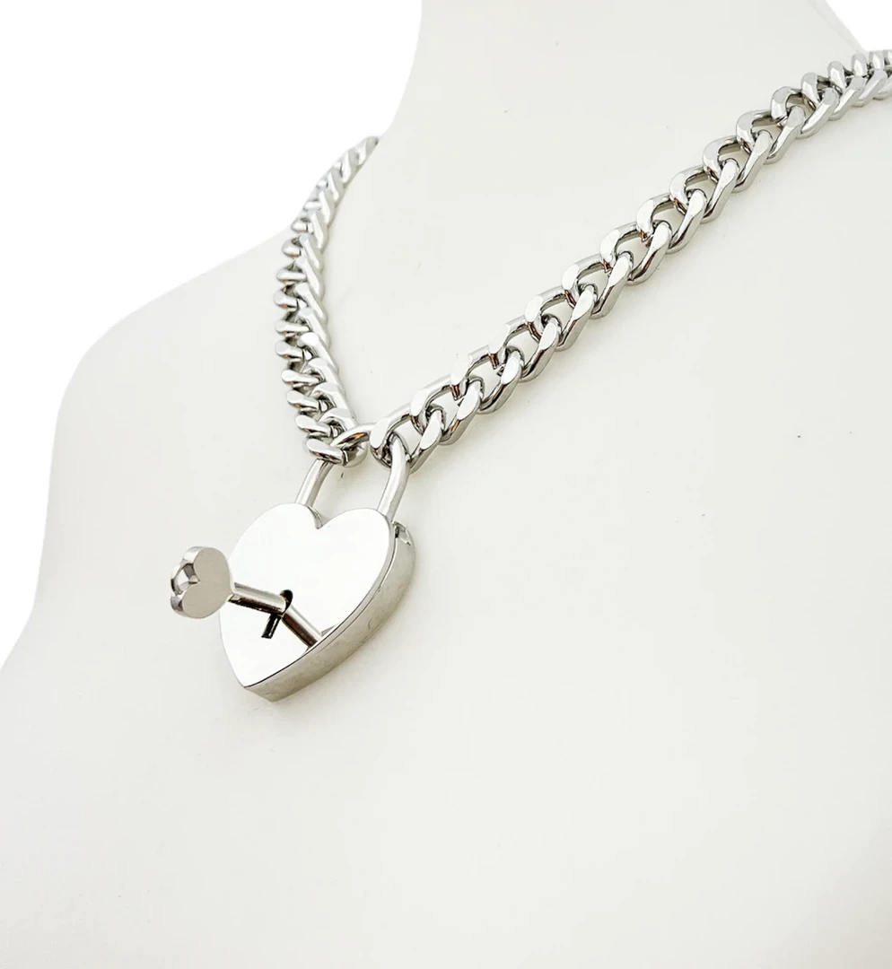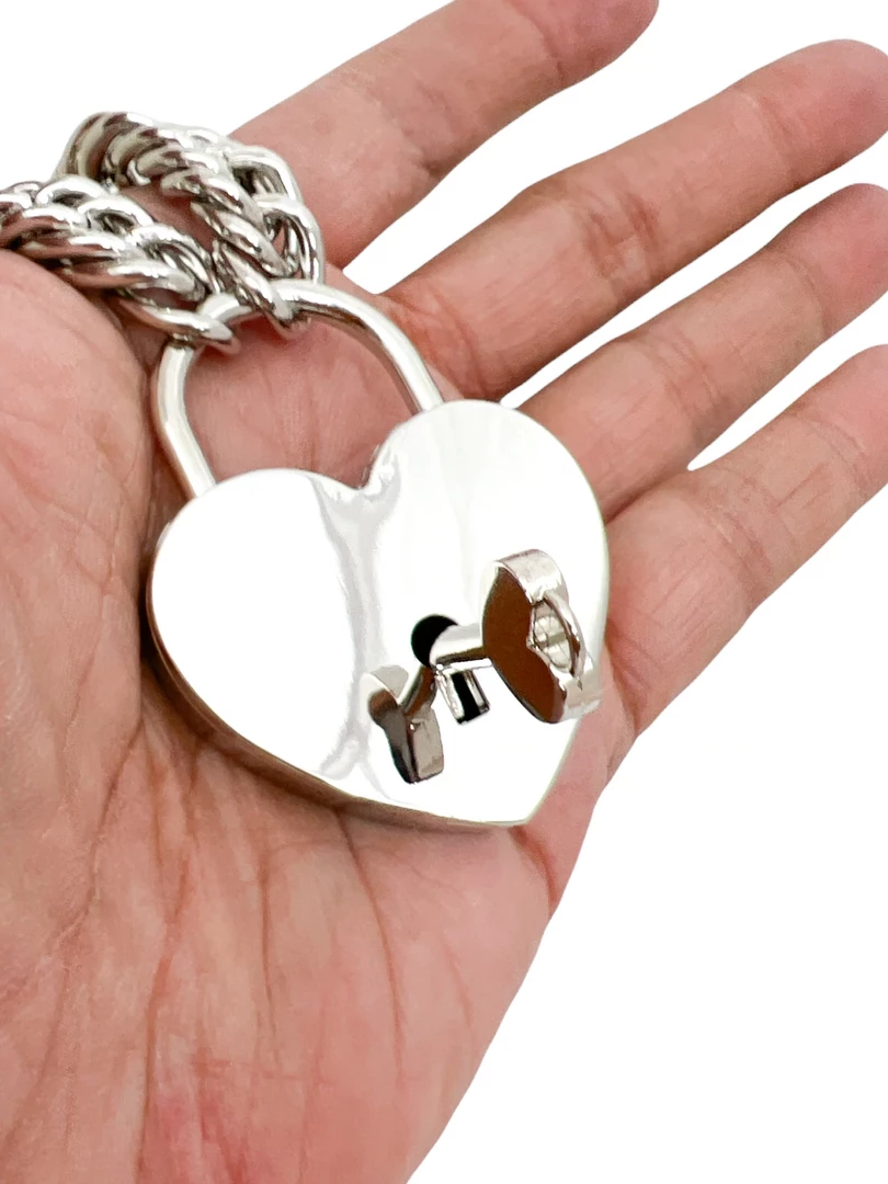 Give them the key to your heart with this XL size chain necklace featuring a real, working, jumbo silver heart shaped lock complete with a matching heart shaped key. Necklace closes with the key.