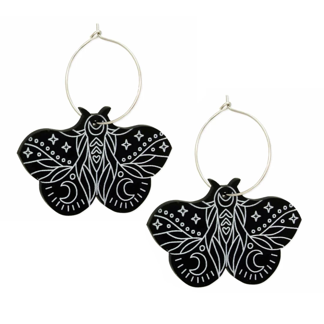 Full of the promise of new beginnings, these symbolic Luna Moth earrings make a stunning addition to any look. A thin silver wire hoop features a large black and white moth drop with a dreamy celestial design. Suitable for wearing with traditional pierced ears and/or stretched lobes alike.