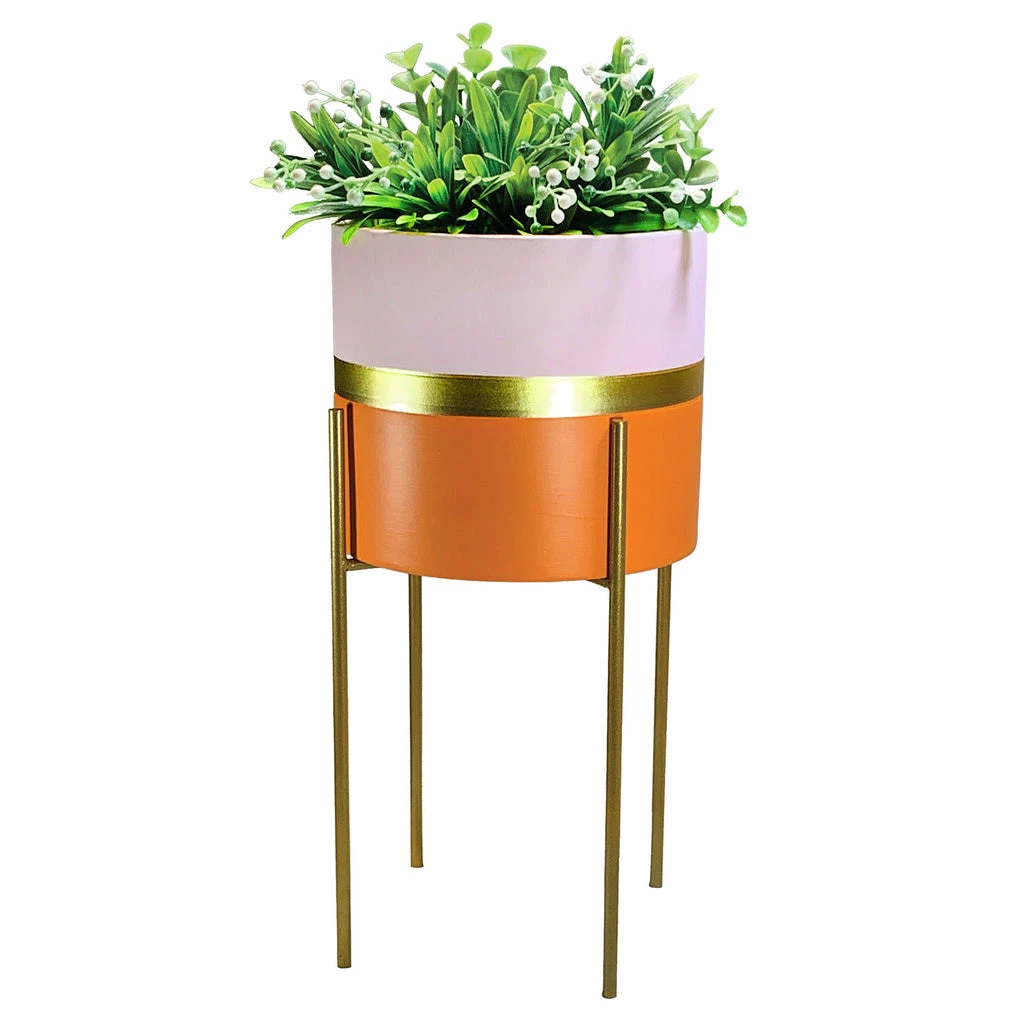 Add a splash of retro color to your home decor with this modernist planter in pink and orange. It comes with a gold stand that allows two different heights for the planter, depending on how you turn it.
