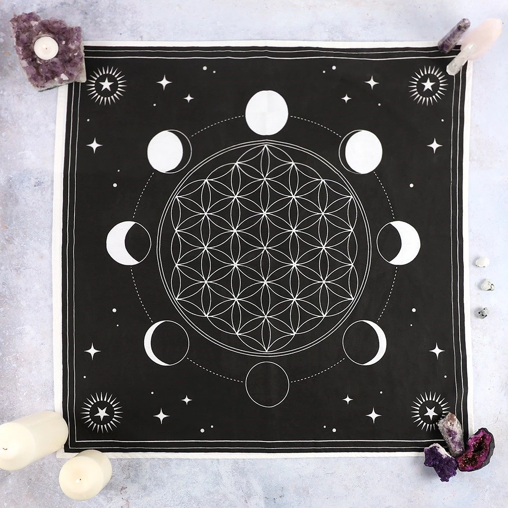 Channel the powerful energy of crystal healing with this cotton altar cloth with printed moon phase design and Flower of Life crystal grid printed in its center. Perfect for arranging crystals and clearing the mind.