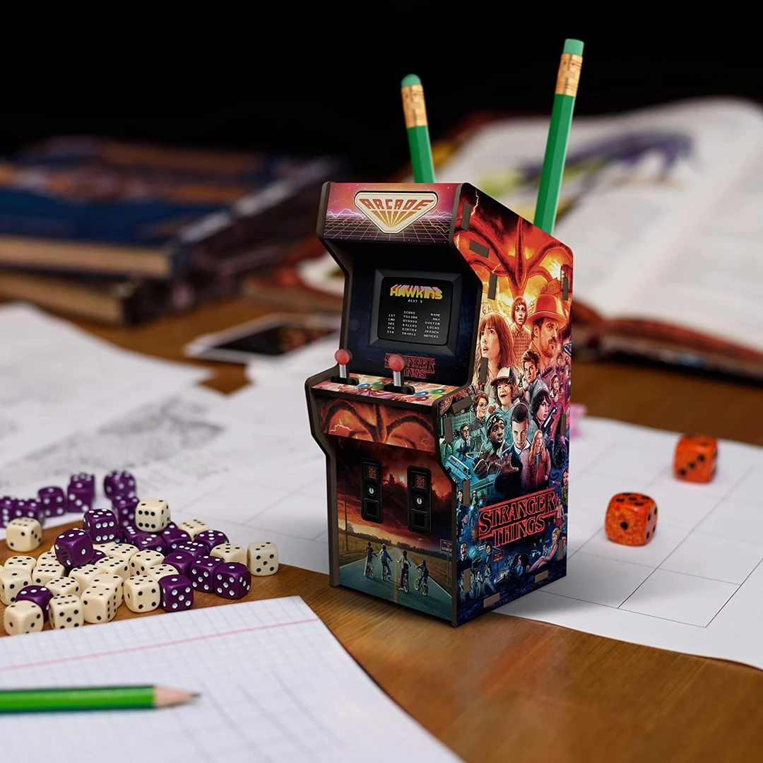 Level up your desk organization with this Stranger Things Arcade Desk Caddy. Featuring all your favorite characters and referencing video games of the 80’s, this display-worthy desk organizer comes flat-packed with simple instructions for quick and easy assembly.