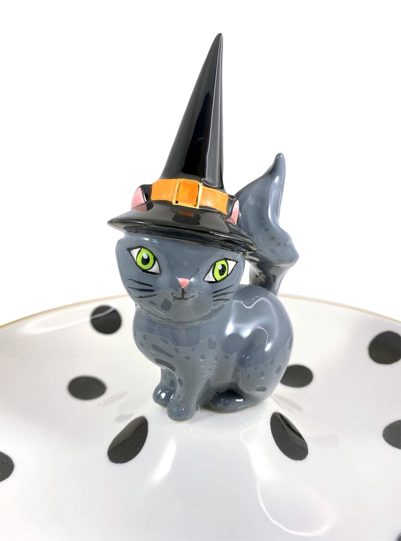 This little witchy kitty is ready to be the center of your Halloween festivities! Donning her best witch hat, she sits atop a black and white polka dot dish, perfect for serving candy, crackers, veggies and more.