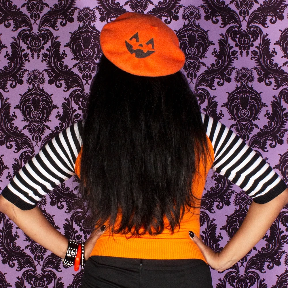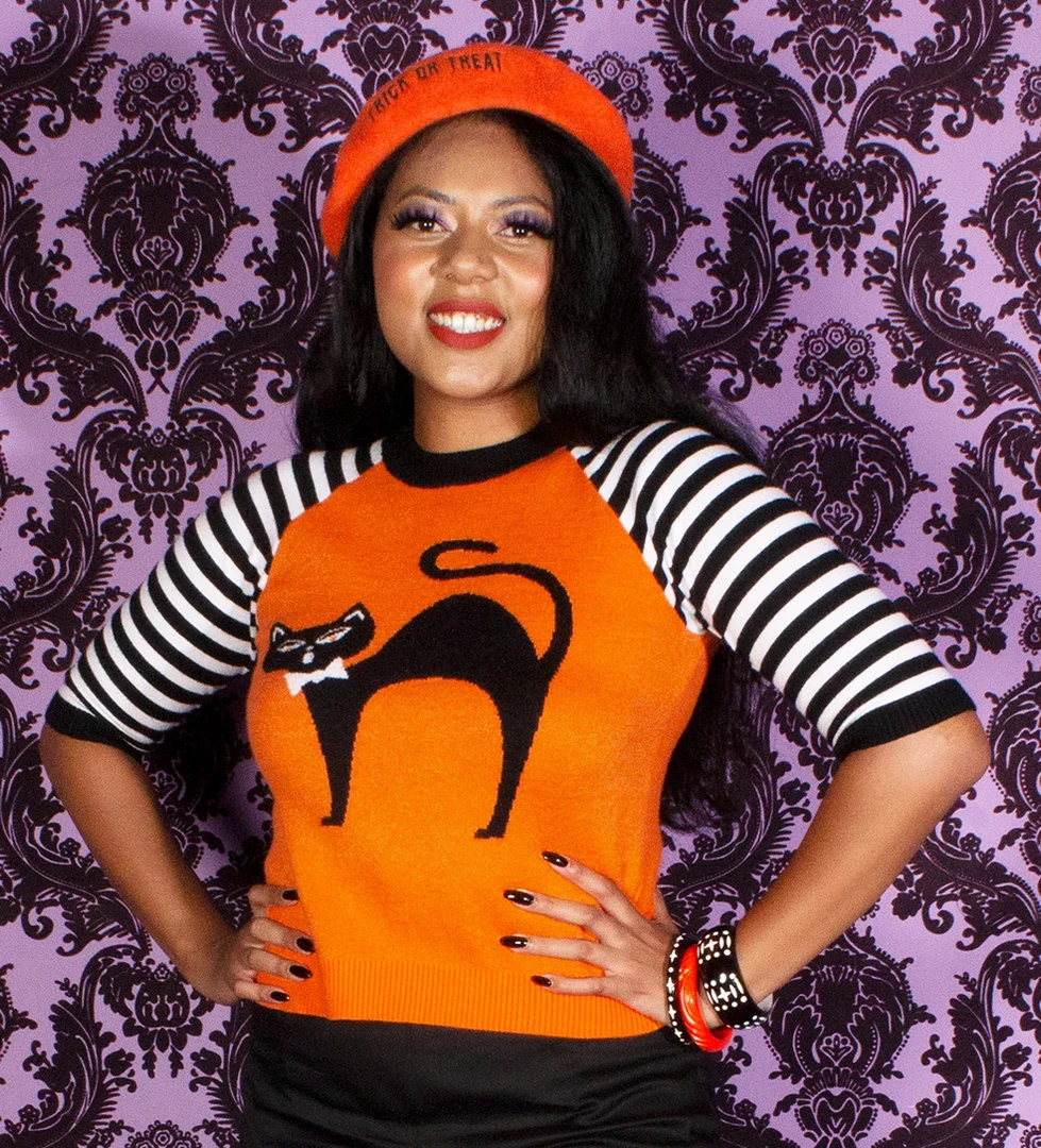 Don’t be a scaredy cat in this cute knit sweater from Oblong Box Shop! Featuring their original Mid Century Modern cat design (complete with a little bow tie!), this sweater is a vibrant orange with black and white striped sleeves. Super soft and stretchy, it’s comfy and flattering with 3/4 length sleeves and a fitted silhouette. Stay warm while staying creepy!