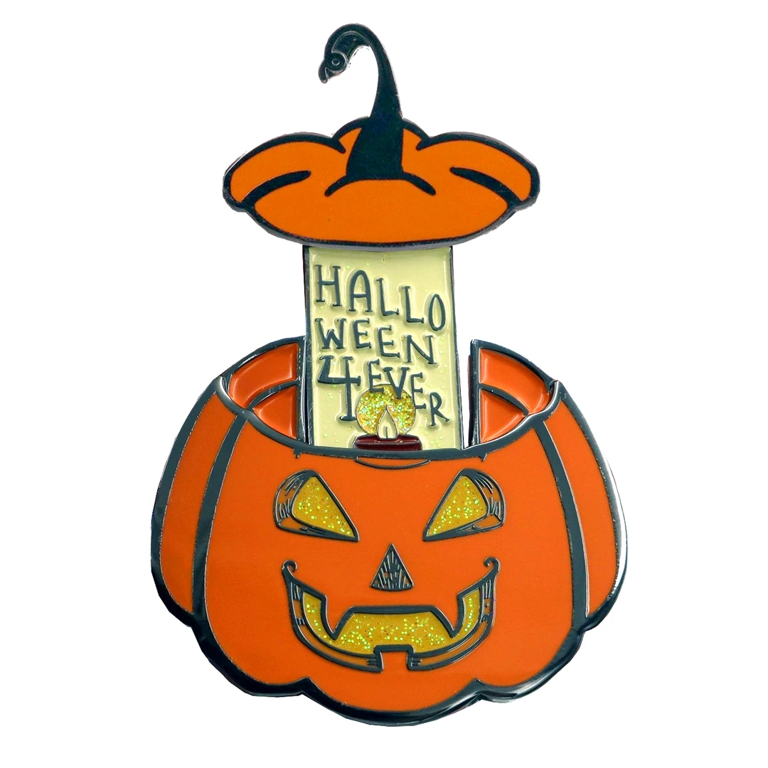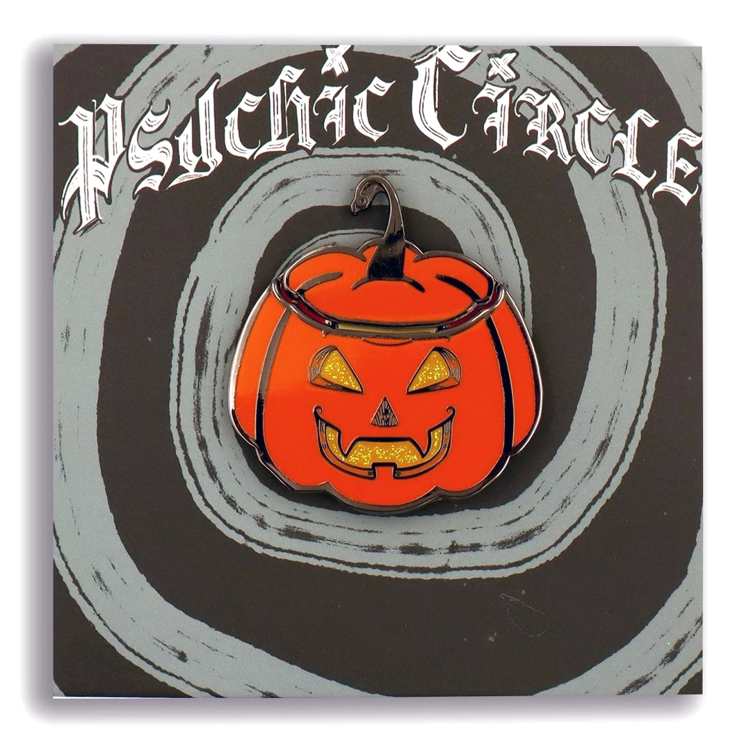 Halloween forever! This fun hard enamel pin from Psychic Circle Oddities has a non-locking slide up pumpkin lid that reveals a special hidden message illuminated by a candle and special glitter enamel accents throughout. • Measures approx. 2” x 2” (closed) / 3” x 2” (open)