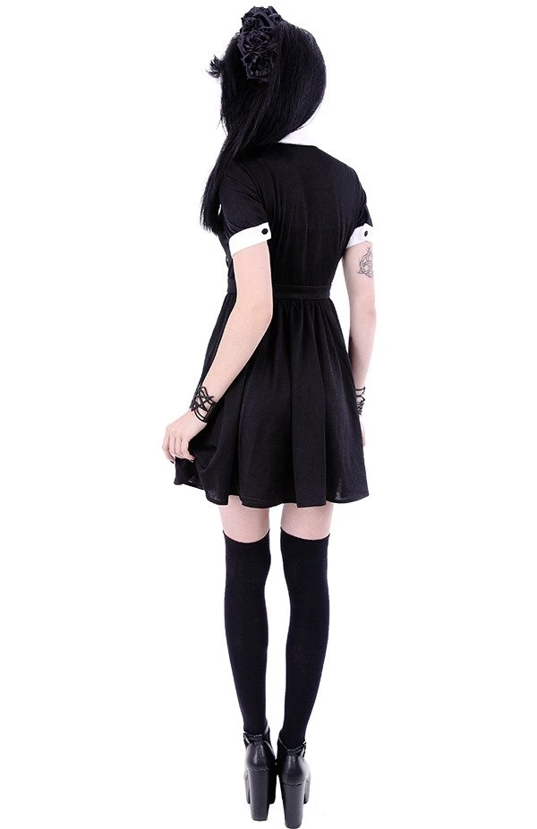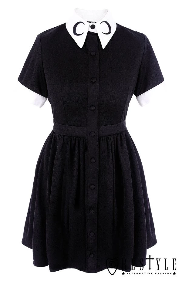 Perfect for all your phases, the Moon Collar Dress from Restyle is a black and white dream! Made of a soft, black fabric, this dress has a statement white collar decorated with crescent moon embroidery in black. The short sleeves have contrast white cuffs with buttons and the dress fastens up the front with matching black buttons. It’s a classic fit and flare style which gives an amazing, hourglass shape to your silhouette!