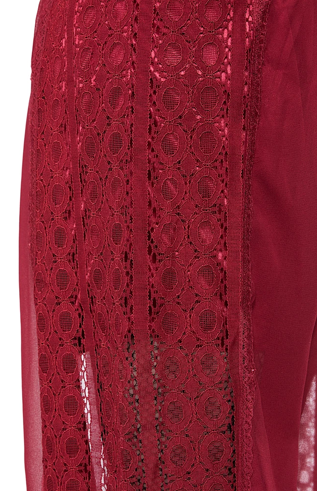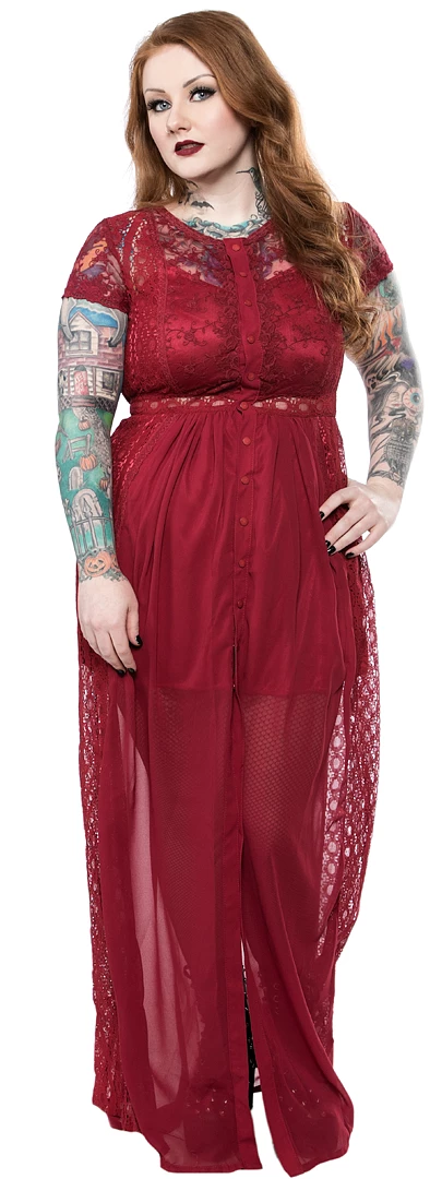 Be an absolute vision in red in this stunning Grace Dress from Restyle. This full length, flowing dress is gorgeous! Made of soft, sheer chiffon and solid lace, it is fitted at the bust and waist but flares out at the bottom, so it perfectly hides any imperfections. The solid under dress hits about mid thigh, while the sheer chiffon reaches to your ankles. Fastens up front with buttons. 100% polyester