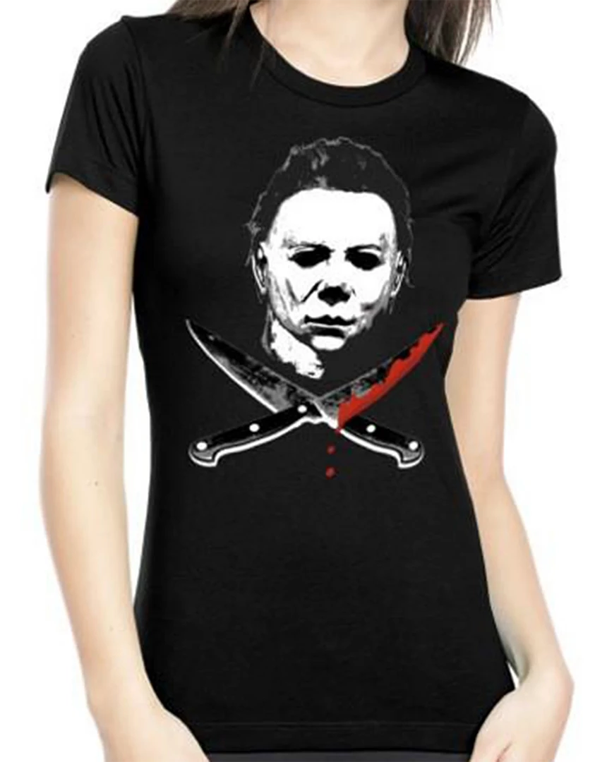 This classic is just what your horror addiction is looking for! This fitted, black, ladies fit tee from Rock Rebel features Michael Myers’ latex face above two crossed knives dripping with blood.