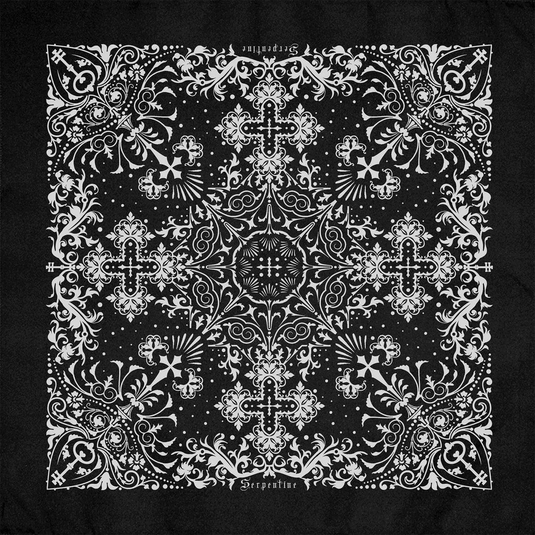 Show your appreciation for Gothic architecture with this new bandana from Serpentine. This Gothica design is white on black and features an intricate design with various crosses and skeleton keys throughout. It’s designed diagonally so once it’s folded and tied it will display at its very best. The cotton fabric makes it easy to wrap and tie on the go!