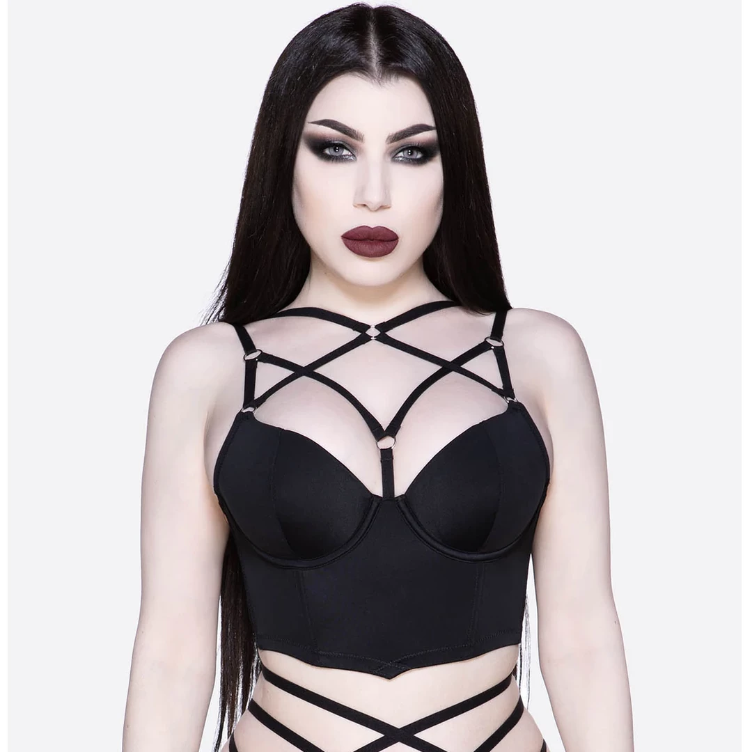 Channel your inner enchantress in the Cage Effect bra from Killstar. Conjured using a luxe soft-touch fabric which stretches to perfection for a seductive yet comfortable fit. Complete with accent straps, undercage detail, statement choker and adjustable back; you’ll feel truly divine wearing this statement piece!